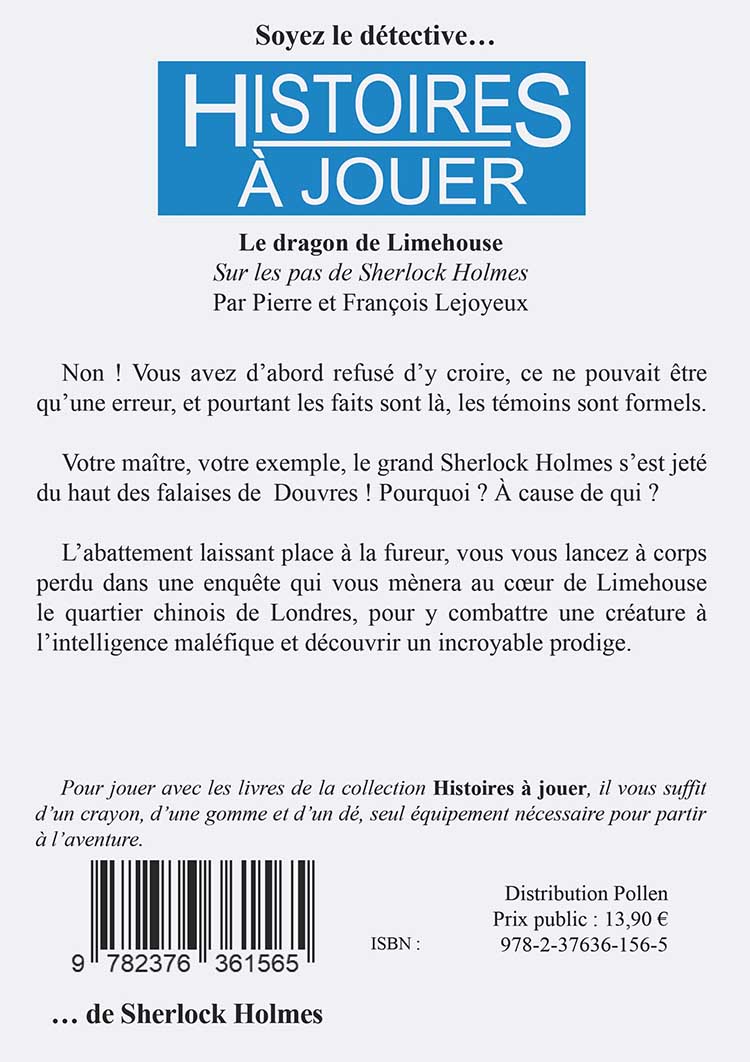 Titre: LE DRAGON DE LIMEHOUSE Titre original: id. (Presse Pocket – 1988) Œuvre: HISTOIRES À JOUER Type: Livre-Jeu Rédaction: Pierre Lejoyeux, François Lejoyeux Illustrationde couverture: : Marcel Laverdet Illustrations intérieures: Rémi Lasfargeas Matériel: livre de 220 pages N&B au format poche à couverture souple Edition: POSIDONIA EDITIONS(PLUMIER DES CHIMÈRES) ISBN: 978-2376361565 (Septembre 2023) Prix moyen constaté: 13,90€