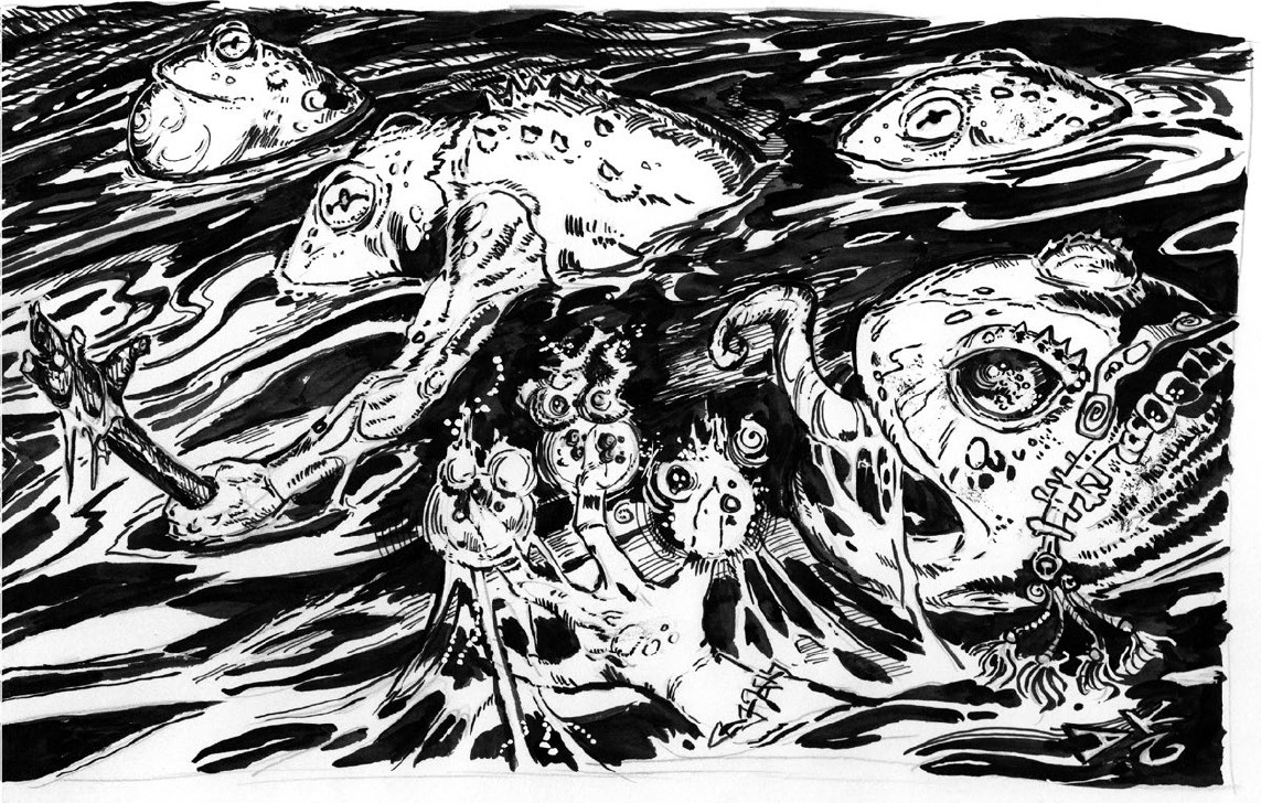 Aussi loin que remonte la mémoire des hommes, les adorateurs du seigneur des Amphibiens maléfiques se livrèrent à d’innombrables rituels dans ses temples trapus érigés loin des zones civilisées. On racontait à leur sujet des histoires de sacrifices humains, de serviteurs rampants et de trésors précieux mais abjects. Et voici qu’à présent, contre toute attente, la secte a disparu, ne laissant derrière ellee que ses sanctuaires qui moisissent dans les marais.