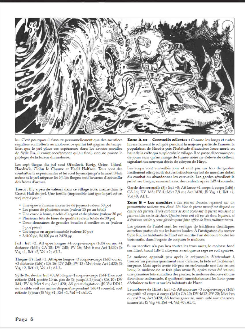 Le fer des lames et même les sorts ne suffiront pas à vaincre le molosse immortel. Pour occire la bête, les personnages devront plonger dans les mystères de la region et de ses rois barbares. Alors seulement, armés de reliques forgées dans un passé sanglant, seuls les plus rusés et les plus courageux des aventuriers pourront défier le molosse de Hirot!