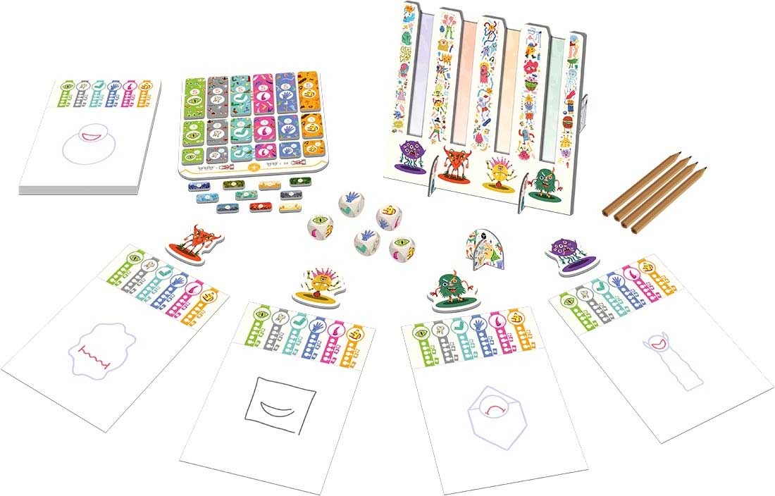 Matériel: 1 Trouillomètre, 5 dés spéciaux, 1 bloc de 50 feuilles (100 dessins), 4 tuiles joueur, 1 jeton premier joueur, 1 plateau de jetons, 18 jetons Peur, 10 jetons Décor, 5 crayons, livret de règles