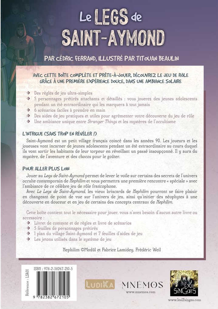 Jouer au Legs de Saint-Aymond permet de lever le voile sur certains des secrets de l’univers occulte contemporain du jeu de rôle Nephilim et vous permettra une première rencontre « spéciale » avec l’ambiance de ce célèbre jeu de rôle francophone. Avec Le Legs de Saint-Aymond. les vieux briscards de Nephilim pourront se faire plaisir en changeant de point de vue sur l’univers de jeu. ainsi qu’initier des néophytes à une découverte en douceur et en jeu de certains des concepts centraux de Nephilim.
