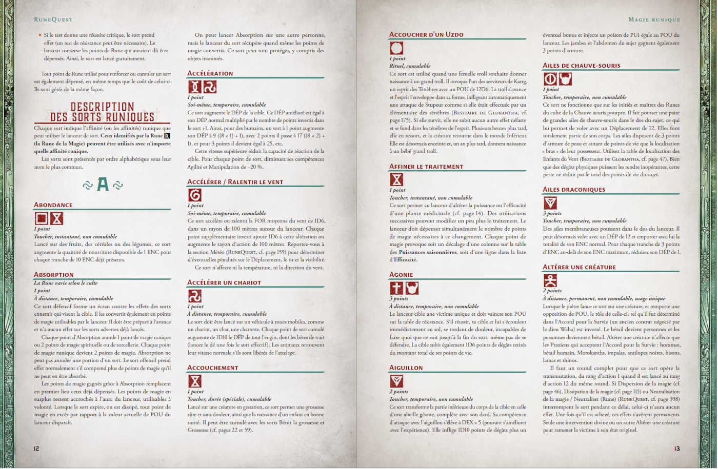 Le Livre Rouge de la Magie, le guide définitif de la magie spirituelle et runique. Les sorts présentés intègrent précisions, corrections et extensions par rapport à ceux inclus dans les règles de RuneQuest, réunis dans un seul livre facile à compulser.