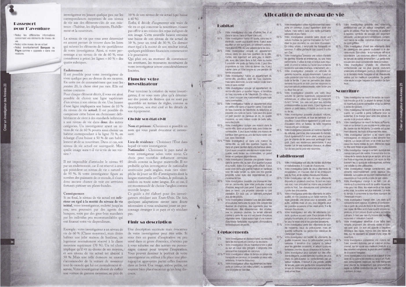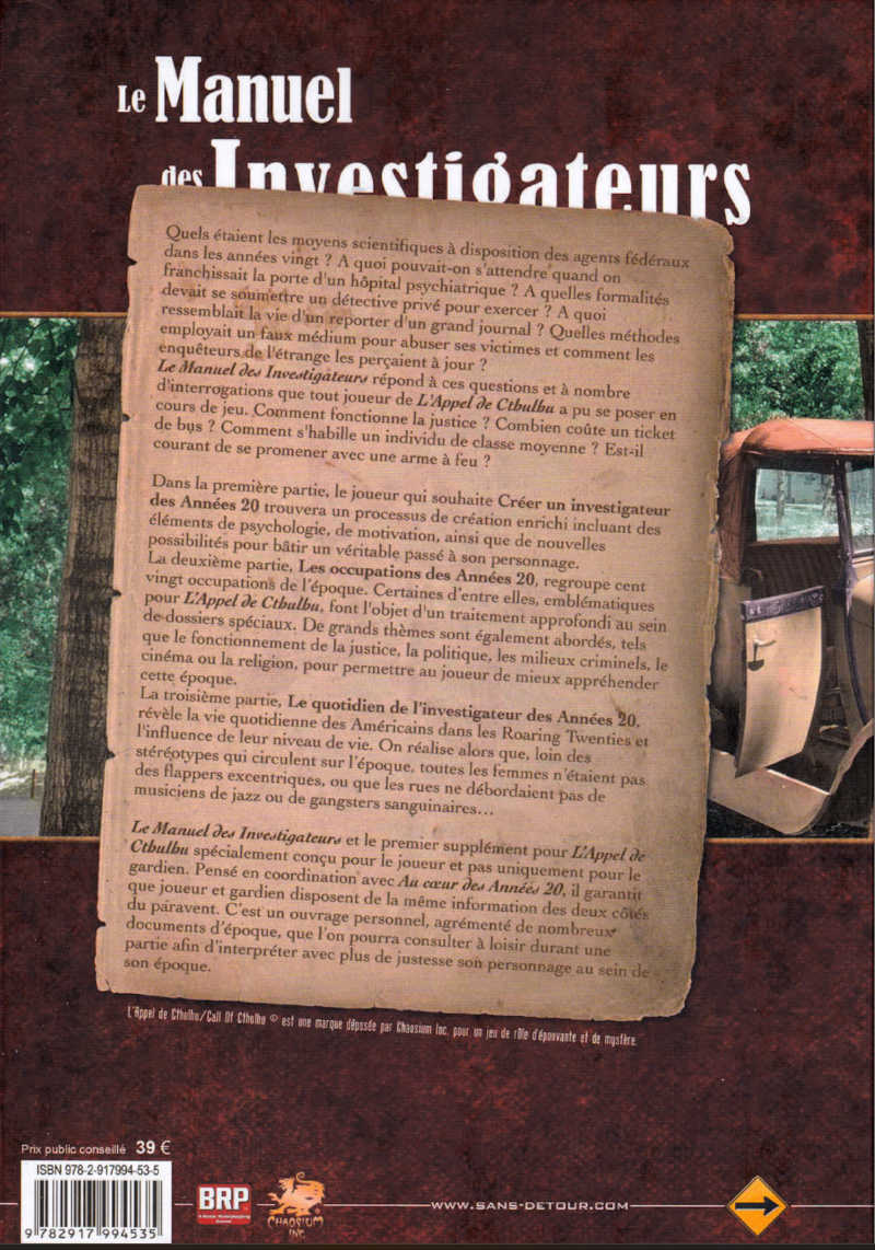 Le Manuel des Investigateurs et (sic) le premier supplément pour L’Appel de Cthulhu spécialement conçu pour le joueur et pas uniquement pour le gardien. Pensé en coordination avec Au Cœur des Années 20, il garantit que joueur et gardien disposent de la même information des deux côtés du paravent. C’est un ouvrage personnel, agrémenté de nombreux documents d’époque, que l’on pourra consulter à loisir durant une partie afin d’interpréter avec plus de justesse son personnage au sein de son époque.