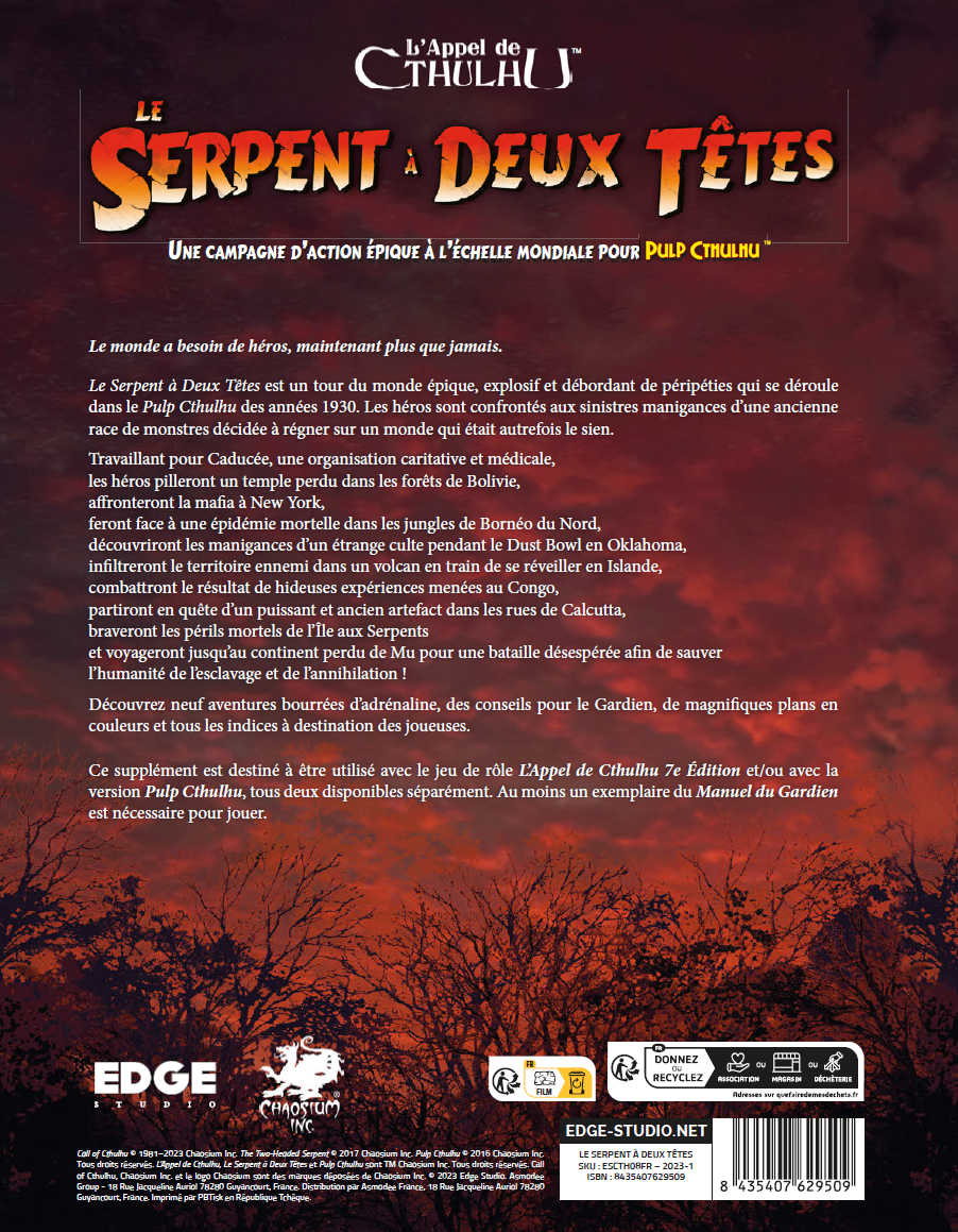 Le Serpent à Deux Têtes est un tour du monde épique, explosif et débordant de péripéties qui se déroule dans le Pulp Cthulhu des années 1930. Les héros sont confrontés aux sinistres manigances d’une ancienne race de monstres décidée à régner sur un monde qui était autrefois le sien.