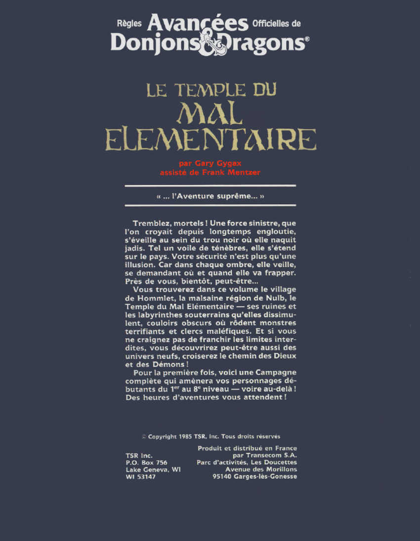 Vous trouverez dans ce volume le village de l’Hommlet, la malsaine de Nulb, le Temple du Mal Élémentaire – ses ruines et les labyrinthes souterrains qu’elles dissimulent , couloirs obscurs où rodent monstres terrifiants et clercs maléfiques. Et si vous ne craignez pas de franchir les limites interdites, vous découvrirez peut-être aussi des univers neufs, croiserez le chemin des Dieux et des Démons!