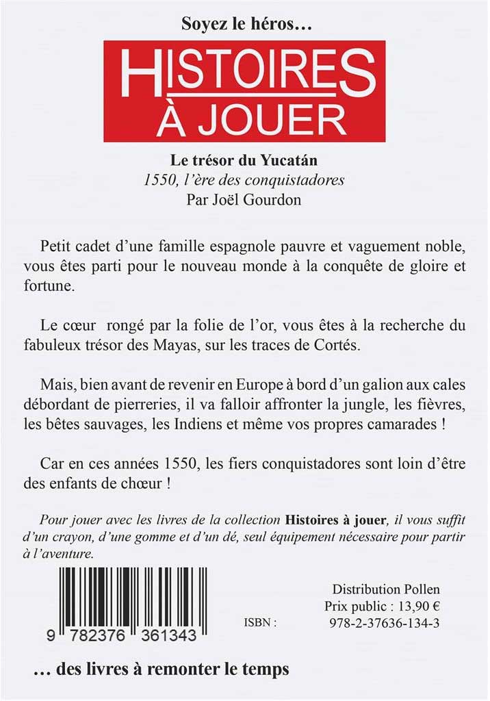 Titre: LE TRÉSOR DU YUCATÁN Titre original: id. (Presse Pocket – 1987) Œuvre: HISTOIRES À JOUER Type: Livre-Jeu Rédaction: Joël Gourdon Illustrationde couverture: : Marcel Laverdet Illustrations intérieures: Joël Bordier Matériel: livre de 220 pages N&B au format poche à couverture souple Edition: POSIDONIA EDITIONS(PLUMIER DES CHIMÈRES) ISBN: 978-2376361343 (Janvier 2023) Prix moyen constaté: 13,90€