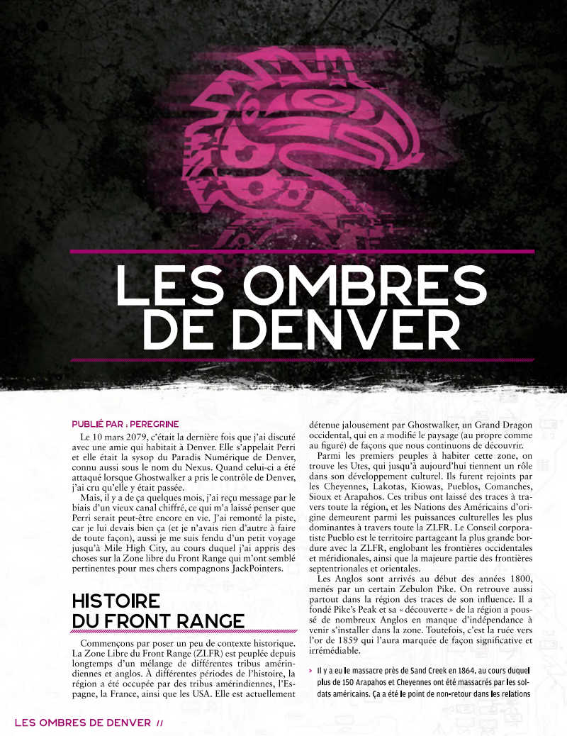 Denver est le théâtre de multiples menaces, une cité tenue par un dragon, et le berceau d’une des plus grandes archives illégales de technologie du monde entier. Les Ombres s’étirent, des complots se fomentent, et les shadowrunners ont là l’opportunité d’apprendre ce qui se trame suffisamment tôt pour se faire quelques nuyens et sauver quelques vies — la leur y compris.