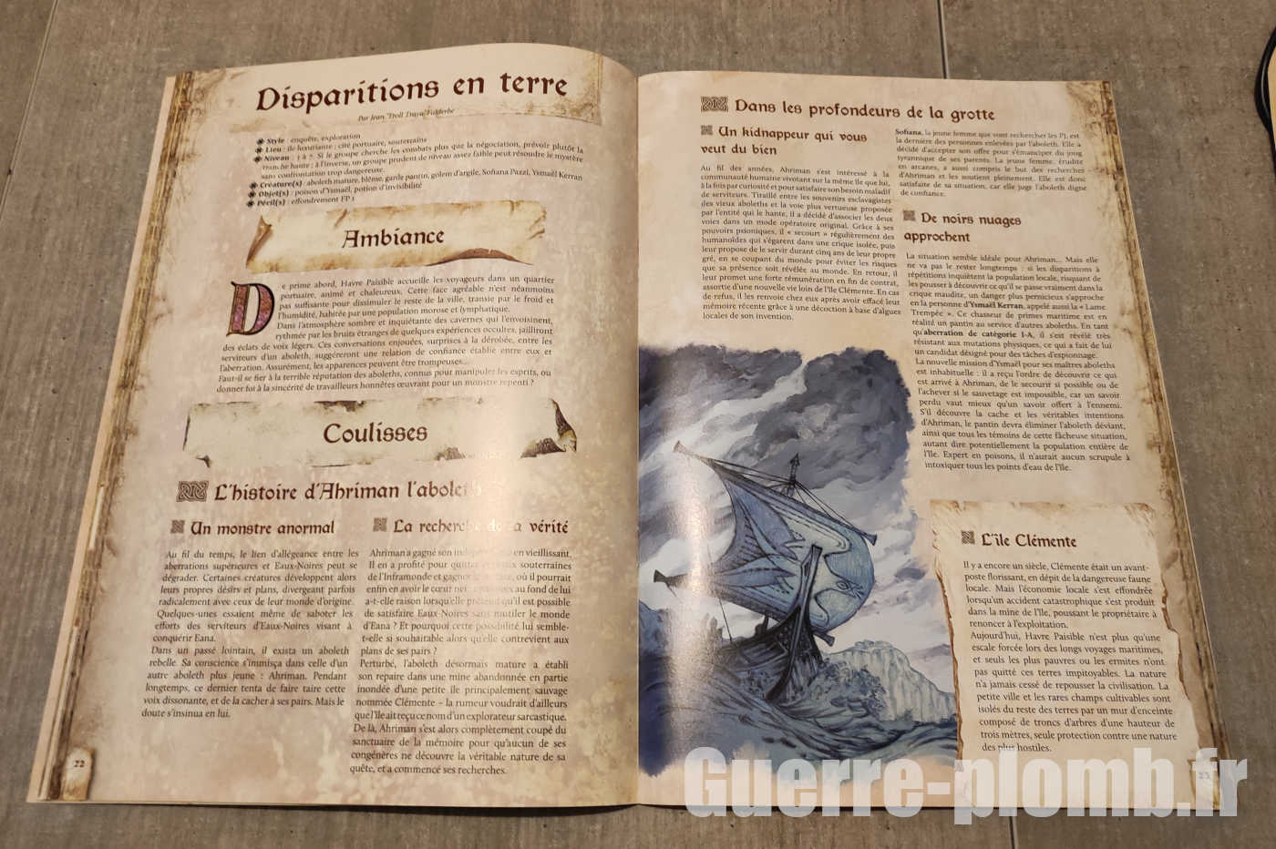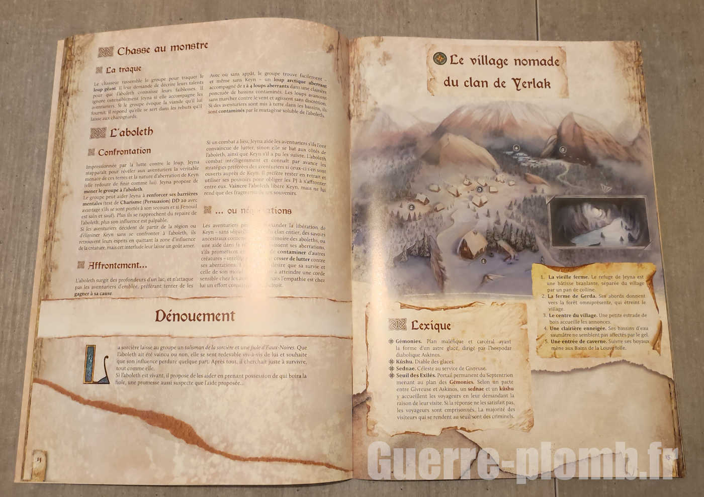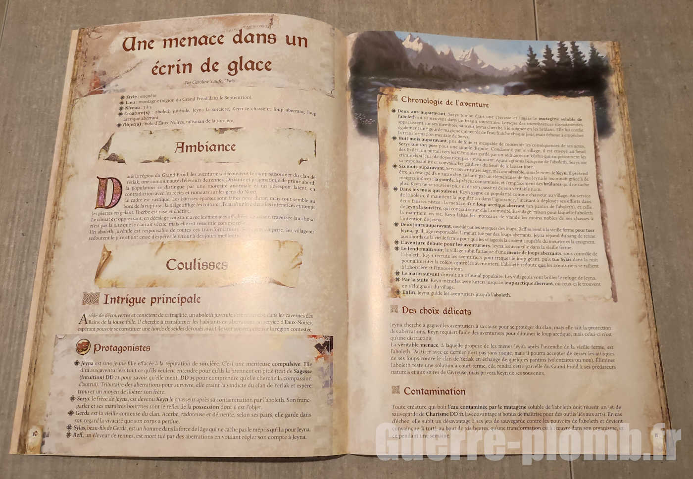 – Autonome : Les aventures présentées peuvent être jouées de manière autonome, que ce soit pour constituer une session courte ou agrémenter une campagne à la découverte d’Eaux-Noires.