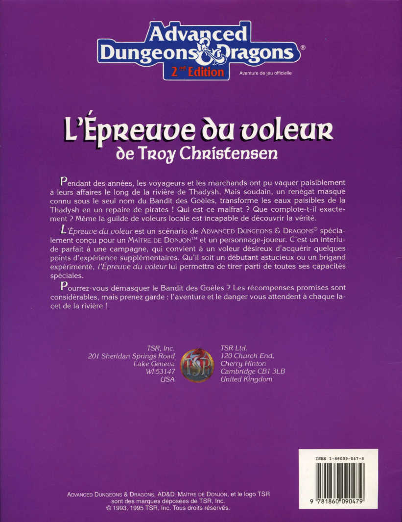 L’Épreuve du voleur est un scénario ADVANCED DUNGEONS & DRAGONS® spécialement conçu pour un maître de donjon et un personnage-joueur. C’est un interlude parfait à une campagne, qui convient à un voleur désireux d’acquérir quelques points d’expérience supplémentaires. Qu’il soit un débutant astucieux ou un brigand expérimenté, l’Épreuve du voleur lui permettra de tirer parti de toutes ses capacités spéciales.