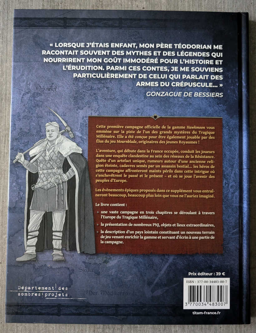 Les Armes du Crépuscule, la première campagne officielle de la gamme Hawkmoon, vous emmène sur la piste de l’un des grands mystères du Tragique Millénaire. L’aventure, qui débute dans la France occupée, conduit les joueurs dans une enquête clandestine au sein des réseaux de la Résistance.