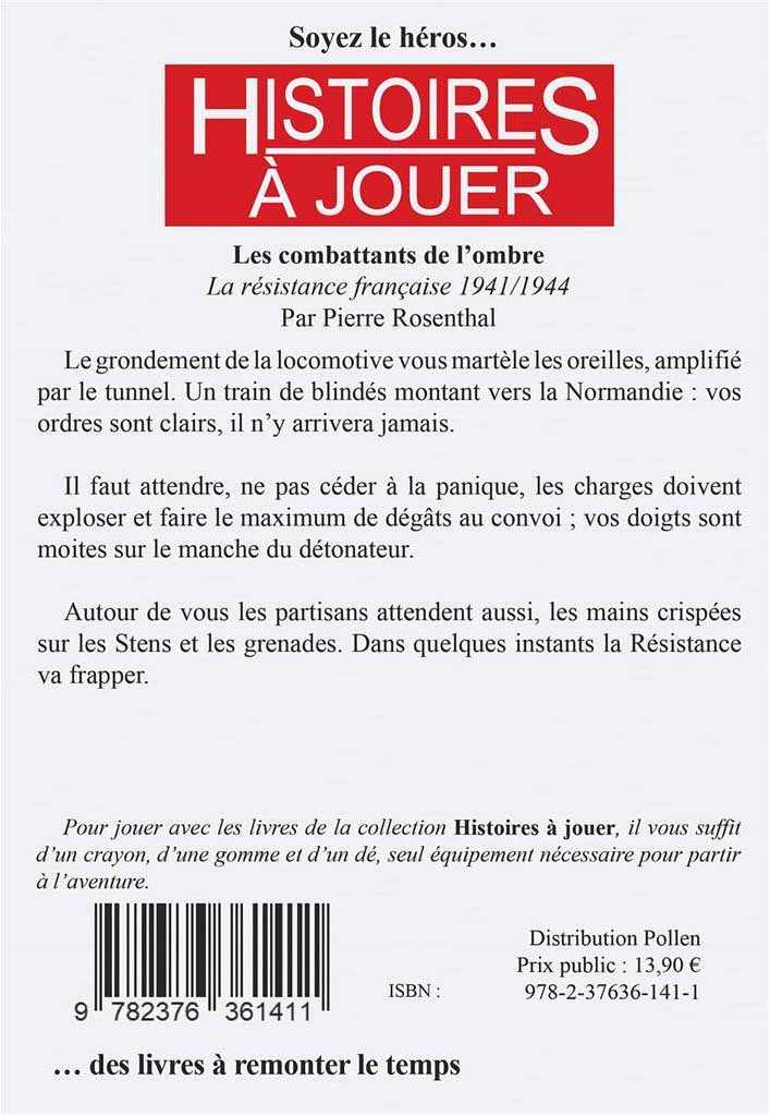 Titre: LES COMBATTANTS DE L’OMBRE Titre original: id. (Presse Pocket – 1987) Œuvre: HISTOIRES À JOUER Type: Livre-Jeu Rédaction: Pierre Rosenthal Illustrationde couverture: : Marcel Laverdet Illustrations intérieures: Philippe Gauckler Matériel: livre de 226 pages N&B au format poche à couverture souple Edition: POSIDONIA EDITIONS(PLUMIER DES CHIMÈRES) ISBN: 978-2376361411 (mars 2023) Prix moyen constaté: 13,90€