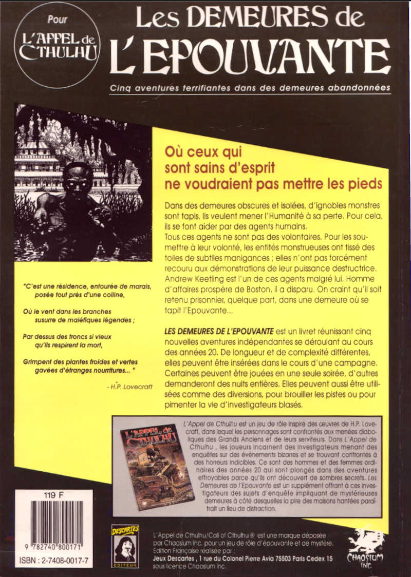 LES DEMEURES DE L’ÉPOUVANTE est un livret réunissant cinq nouvelles aventures indépendantes se déroulant au cours des années 20. De longueur et de complexité différentes, elles peuvent être insérées dans le cours d’une campagne. Certaines peuvent être jouées en une seule soirée, d’autres demanderont des nuits entières. Elles peuvent aussi être utilisées comme des diversions, pour brouiller les pistes ou pour pimenter la vie d’investigateurs blasés.