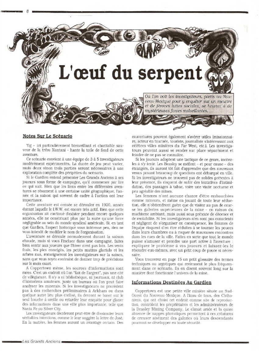 Les Grands Anciens est un recueil de six scénarios pour l’Appel de Cthulhu: « L’Œuf du Serpent » se déroule au Far-West, avec des indiens, des vieilles carnes et des mauvais garçons; « L’Eau qui Dort » est une aventure qui conviendra à ceux qui ont horreur de prêter des livres; « Dites-moi, auriez-vous vu le Signe Jaune? » organise une halte riche de symboles à la New-Orleans; « Les Ténèbres qui tuent » met en action des voyous des quartiers sud de Boston; « Le Dieu Blême » fait découvrir aux investigateurs un contrat d’un genre nouveau; « La Lune Maléfique » sera une expérience à ne pas oublier. Toutes ces aventures peuvent être reliées les unes aux autres, formant ainsi une véritable campagne, mais elles peuvent aussi jouées indépendamment les unes des autres.