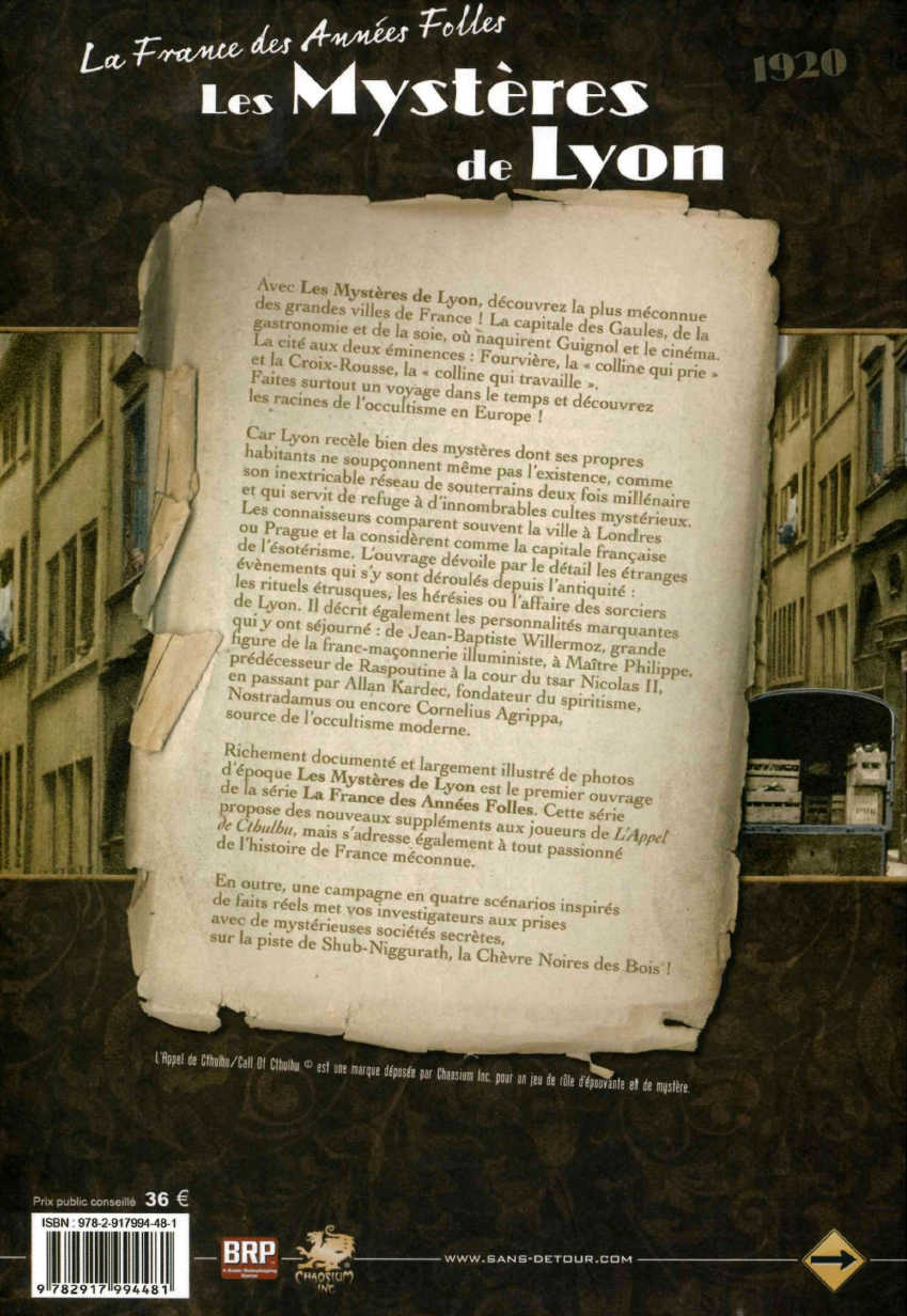 Richement documenté et largement illustré de photos d’époque Les Mystères de Lyon est le premier ouvrage de la série La France des Années Folles. Cette série propose de nouveaux suppléments aux joueurs de L’Appel de Cthulhu, mais s’adresse également à tout passionné de l’histoire de France méconnue.