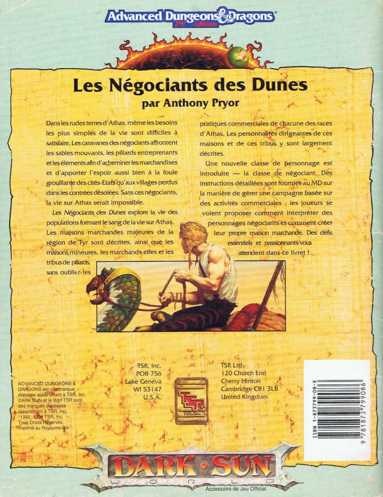 Dans les rudes terres d’Athas, même les besoins les simples de la vie sont difficiles à satisfaire. Les caravanes des négociants affrontent les sables mouvants, les pillards entreprenants et les éléments afin d’acheminer les marchandises et d’apporter l’espoir aussi bien à la foule grouillante des cités-états qu’aux villages perdus dans les contrées désolées. Sans ces négociants, la vie sur Athas serait impossible.