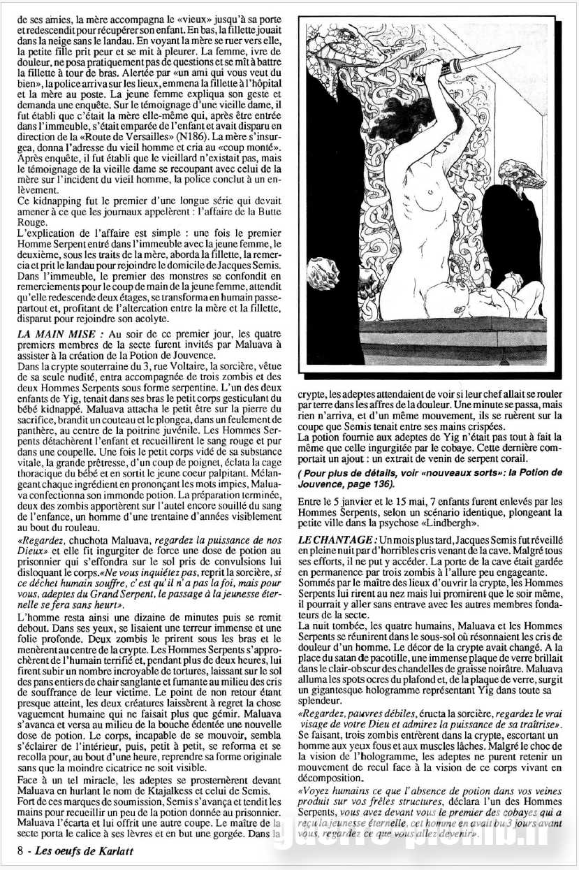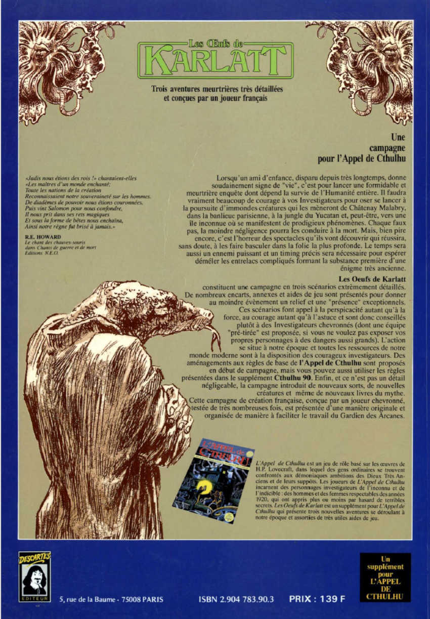 Les Œufs de Karlatt constituent une campagne en trois scénarios extrêmement détaillés. De nombreux encarts, annexes et aides de jeu sont présentés pour donner au moindre évènement un relief et une « présence » exceptionnels. Ces cénarios font appel à la perspicacité autant qu’à la force, au courage autant qu’à l’astuce et sont donc conseillés plutôt à des investigaterus chevronnés (dont une équipe « pré-tirée » est proposée, si vous ne voulez pas exposer vos propores personnages à des dangers aussi grands). L »action se situe à notre éqpoque et toutes les ressources de notre monde moderne sont à la disposition des courageux investigateurs. Des aménagements aux règles de base de l’Appel de Cthulhu sont proposés en début de campagne, mais vous pouvez aussi utiliser le srègles présentées dans le supplément Cthulhu 90. Enfin, et ce n’est pas un détail, la campagne introduit de nouveaux sorts, de nouvelles créatures et même un nouvau livre du Mythe. Cette campagne de création française, conçue par un joueur chevronné, testée de nombreuses fois, est présentée de manière originale et organisée de manière à faciliter le travail du Gardien des Arcanes.