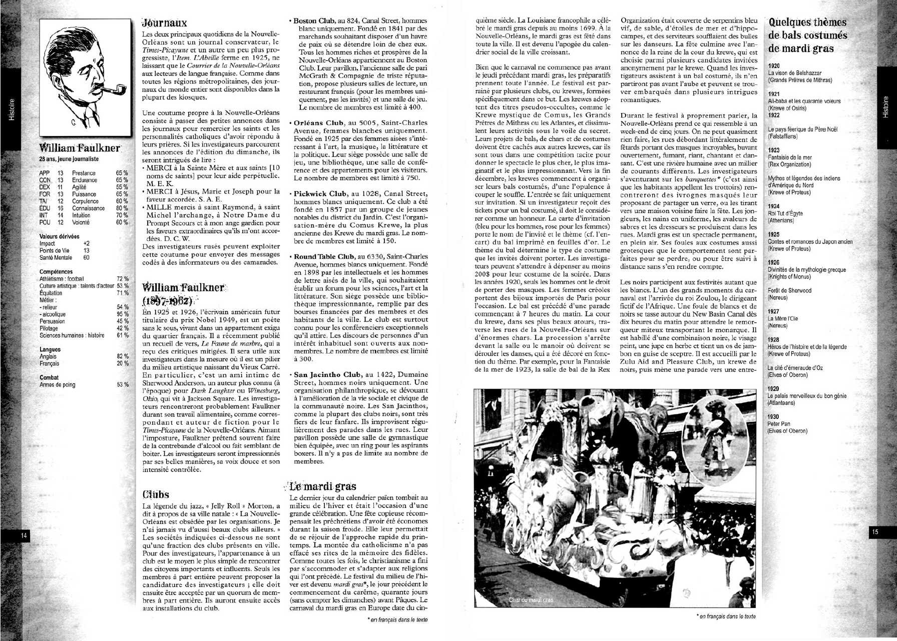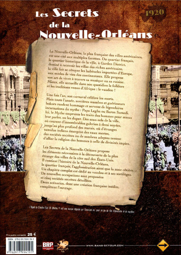 Les Secrets de La Nouvelle-Orléans propose les éléments nécessaires à la découverte de la plus étranges des villes de la côte sud des États-Unis. il contient l’histoire de la Nouvelle-Orléans, le quartier français, l’agglomération ainsi que la zone côtière. Un chapitre complet est dédié au vaudou et à ses sortilèges. De nouvelles occupations sont proposés ainsi que cinq sociétés secrètes détaillées. Deux scénarios, dont une de création française inédite, complètent l’ouvrage.
