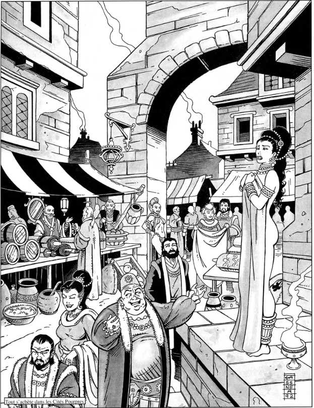 Pour le joueur ce chapitre apporte de nouvelles compétences, armes, armures ainsi que des informations sur les personnages provenant des Cités Pourpres. - Ses cultes: les temples, les prêtres, les cérémonies, l’organisation et les pouvoirs des religions dominantes.