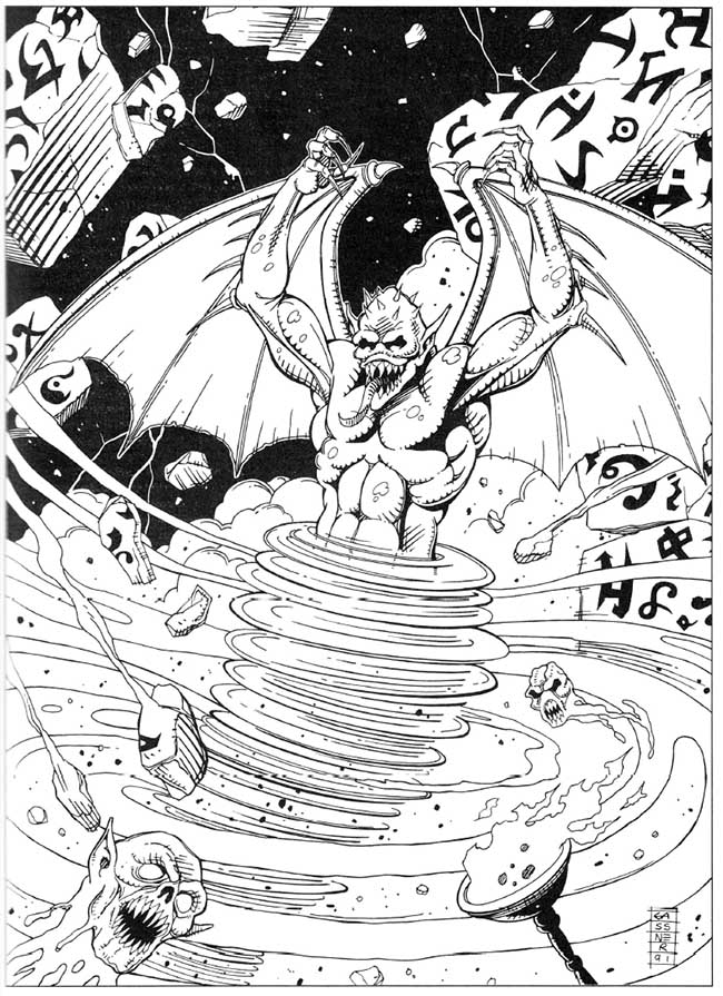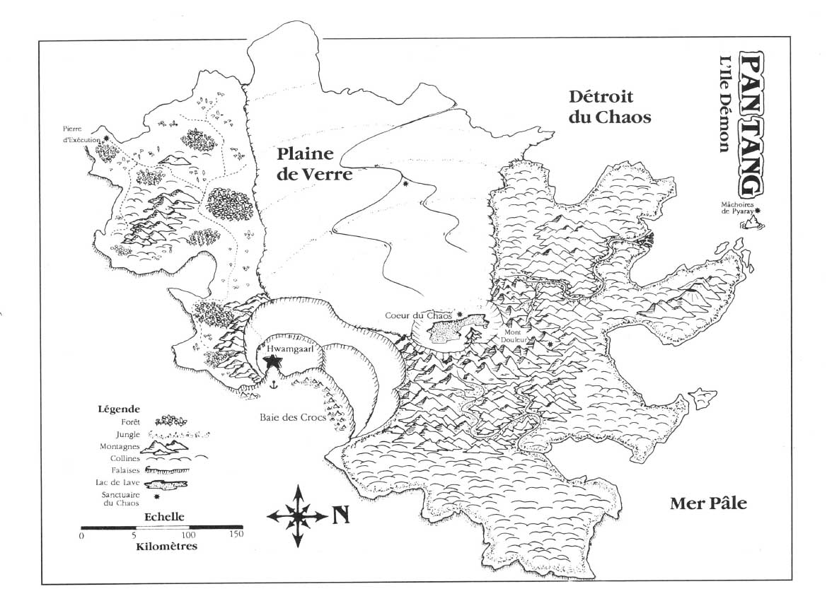 Ce supplément décrit cette île démon du jeu de rôle Stormbringer. Il ne prétend pas être une référence en matière de documentation sur la vie et la culture de l’île. Vous y trouverez une évocation des terribles gémissements des statues hurlantes, quelques éléments sur les pratiques diaboliques de l’Eglise du Chaos et les implications qu’entraînent le terrible pouvoir détenu par le Théocrate. Vous n’y trouverez pas d’iniormations tels le nombre de vaisseaux pouvant aborder dans ie port de Hwamgirarl, l’heure des rondes sur les murailles noires de la cité ou une liste exhaustive de ce que contient chaque bâtiment. Michael Moorcock n’a jamais apporté de tels détails, de même il n’en a jamais ressenti le besoin. Concentrez-vous sur l’ambiance régnant à Pan Tang et créez les données techniques suivant les necessités de votre campagne.