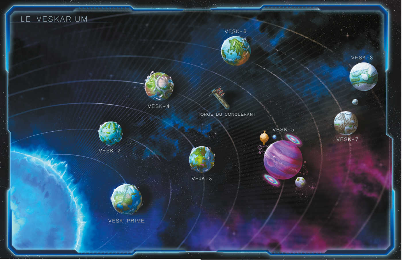- La description des neuf mondes du Veskarium, l’empire interstellaire fondé par la race militariste des vesks, ainsi que de vingt autres planètes et civilisations de l’Espace proche.