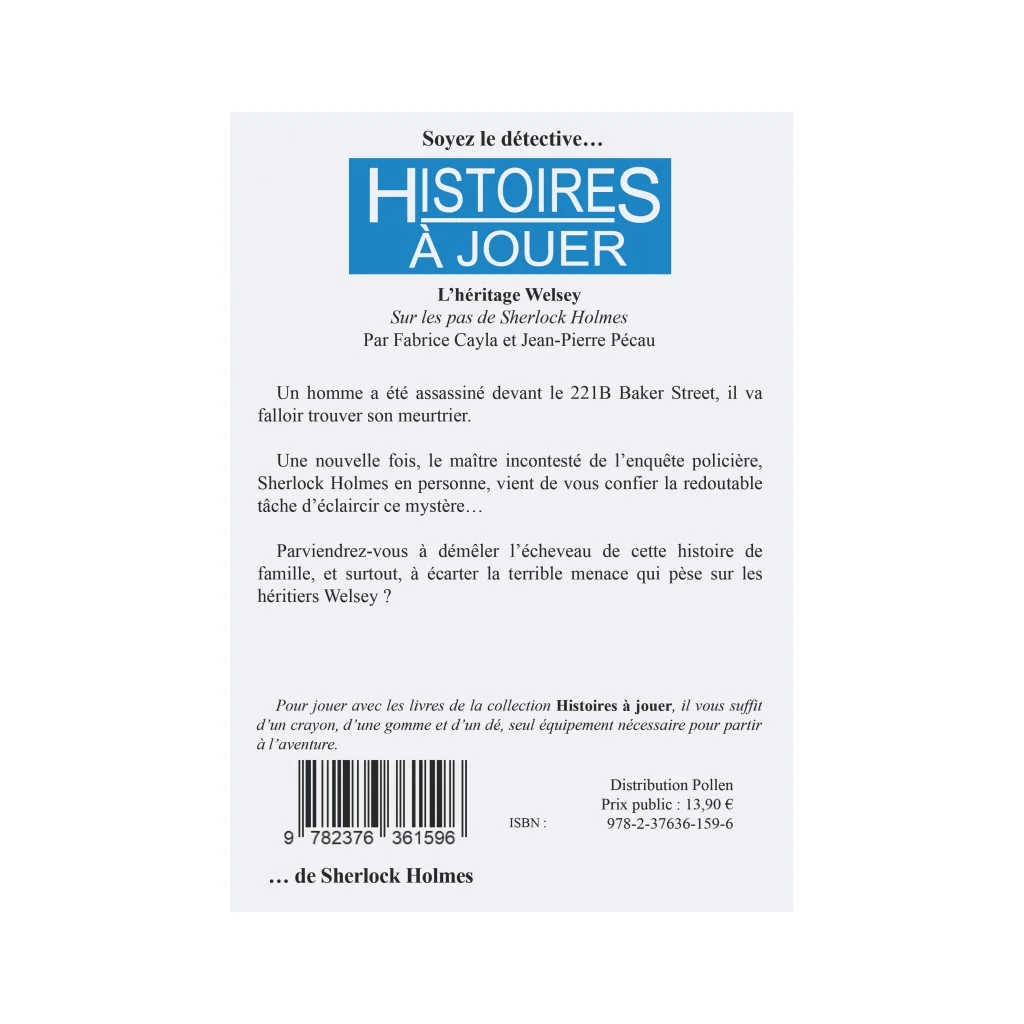 Titre: L’HÉRITAGE WESLEY Titre original: id. (Presse Pocket – 1987) Œuvre: HISTOIRES À JOUER Type: Livre-Jeu Rédaction: Fabrice Cayla, Jean-Pierre Pécau Illustrationde couverture: : Marcel Laverdet Illustrations intérieures: ¨Philippe Lechien Matériel: livre de 242 pages N&B au format poche à couverture souple Edition: POSIDONIA EDITIONS ISBN: 978-2376361367 (Octobre 2018) Prix moyen constaté: 13,90€