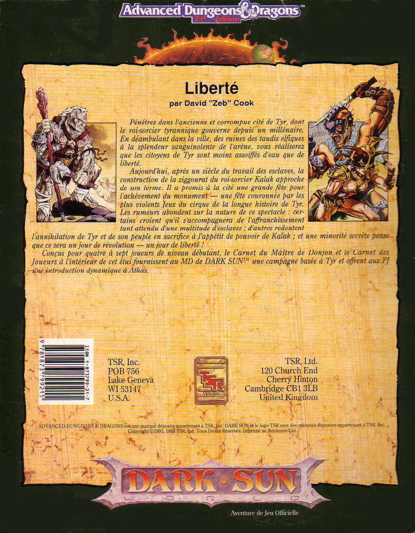 Aujourd’hui, après un siècle de travail des esclaves, la construction de la ziggourat du roi-sorcier approche de son terme. il a promis à la cité une grande fête pour l’avènement du monument – une fête couronnée par les plus violents Jeux du cirque de la longue histoire de Tyr. Les rumeurs abondent sur la nature de ce spectacle: certains croient qu’il s’accompagnera de l’affranchissement tant attendu d’une multitude d’esclaves; d’autres redoutent l’annihilation de Tyr et de son peuple en sacrifice à l’appétit de pouvoir de Kalak; et une minorité secrète pense que cela sera un jour de révolution – un jour de Liberté!