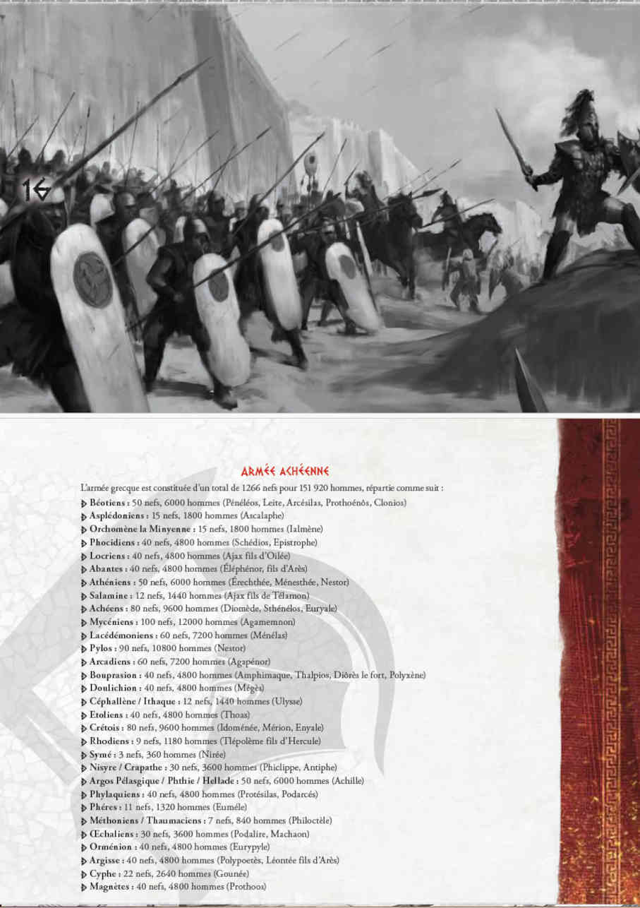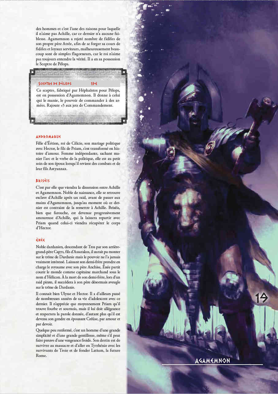 Je ne saurais trop conseiller aux MJs de lire ou relire ces oeuvres afin de mieux appréhender la psychologie des personnages et de s’inspirer de la narration de ces aèdes ou d’auteurs plus moderne comme David Gemmel. L’Iliade d’Homère va être notre source principale d’information, mais c’est aussi la vision de la guerre du point de vue des vainqueurs et, en tant que Grec, il a forcément enjolivé le rôle des héros achéens. Ne dit-on pas que ce sont les vainqueurs qui réécrivent l’Histoire !