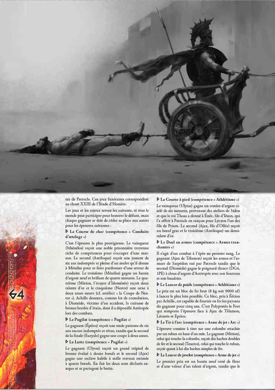 Dernière chose, beaucoup de ces chants sont des moments clés de l’Histoire et les PJs peuvent venir y altérer le cours des évènements même s’il est très difficile, voire impossible, de modifier ce que les dieux ont décidé. La plupart des scénarii étant très ouverts, compte tenu des possibilités qui s’offrent aux PJs, ils demanderont une part d’improvisation importante de la part des meneurs pour que ses joueurs conservent un certain intérêt au jeu.