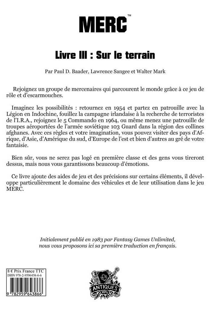 Dans MERC, rejoignez un groupe de mercenaires qui parcourent le monde. Imaginez les possibilités : retournez en 1954 et partez en patrouille avec la Légion en Indochine, fouillez la campagne irlandaise à la recherche de terroristes de l’I.R.A., rejoignez le 5 Commando en 1964, ou même menez une patrouille de troupes aéroportées de l’armée soviétique 103 Guard dans la région des collines afghanes. Avec ces règles et votre imagination, vous pouvez visiter des pays d’Afrique, d’Asie, d’Amérique du sud, d’Europe de l’est et bien d’autres au gré de votre fantaisie.