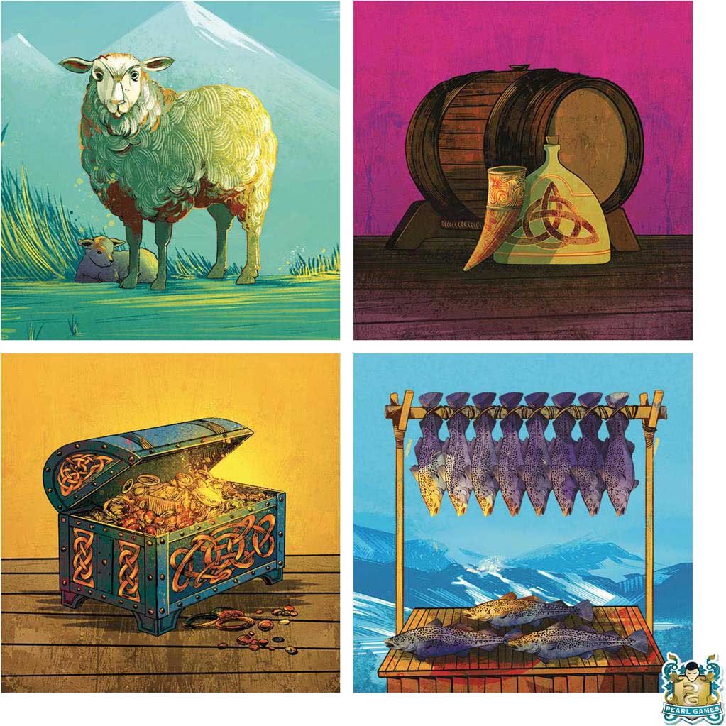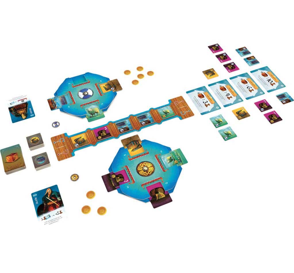 Matériel:16 cartes Entrepôt 2, 2 cartes Aide de jeu, 1 carte Premier joueur, 36 cartes Commande, 1 plateau Marché, 2 roues Flotte, 8 tuiles Drakkar, 8 pièces de monnaie, 32 tuiles Marchandise, 2 jetons Boucliers, 8 cartes Jarl, 7 cartes Exigences du Jarl, 1 livret de règles