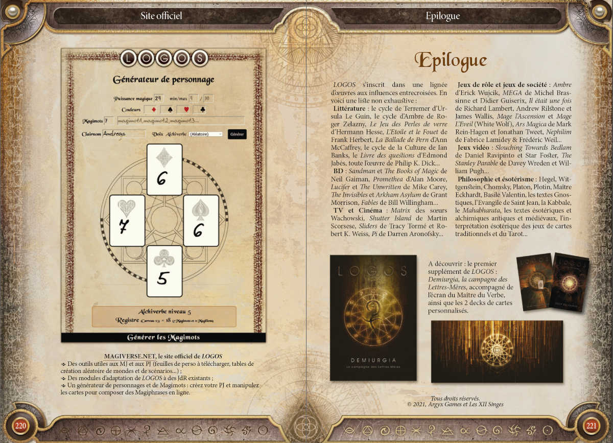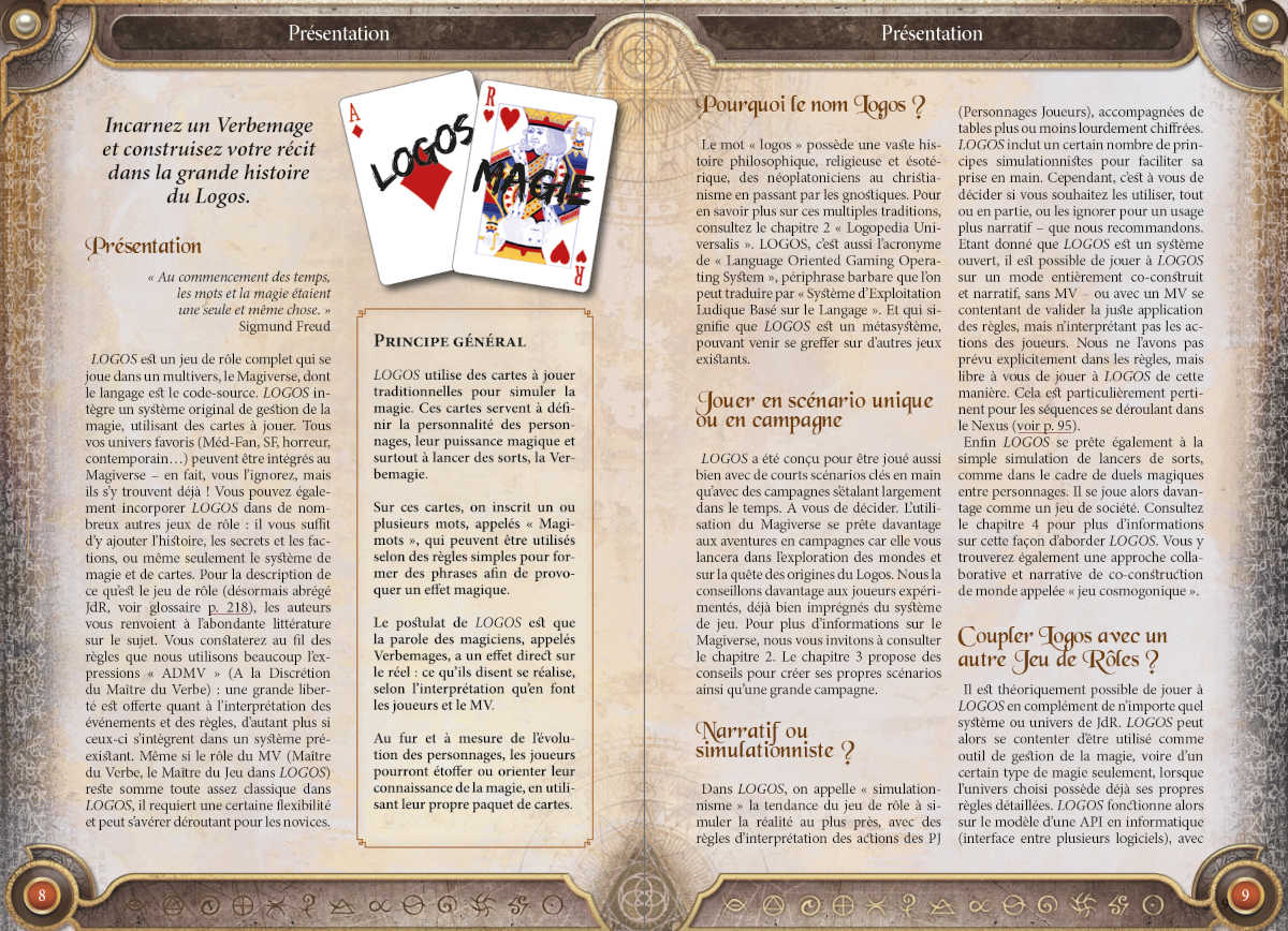 Logos est un jeu de rôle dans lequel les participants incarnent des Verbemages, des magiciens exerçant leur art par la parole. Pour cela, LOGOS utilise un système original de gestion de la magie à l’aide de cartes à jouer.