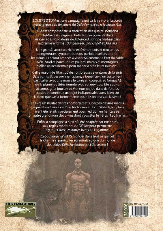 L’Ombre d’Elim est une campagne de quatre scénarios pour Défis Fantastiques – le Jeu de rôle. Il s’agit de la traduction des scénarios de Marc Gascoigne et Pete Tamlyn présents dans les ouvrages Dungeoneer, Blacksand ! et Allansia qui ont jeté les premières pierres du jeu de rôle Advanced Fighting Fantasy, modernisé par Graham Bottley.