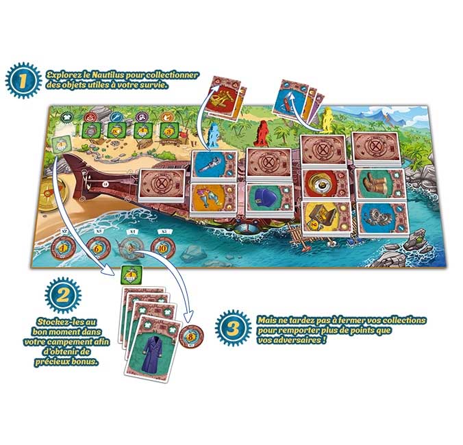 Pendant leur tour, les joueurs déplacent leur marqueur Naufragé dans une colonne et choisissent ensuite de collecter des cartes Objet de la colonne ou de poser des cartes de leur main pour commencer une collection. Le stockage d’objets permet aux joueurs de réclamer des jetons bonus et/ou hublots avant leurs adversaires et d’obtenir des points de victoire.