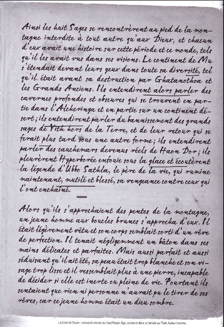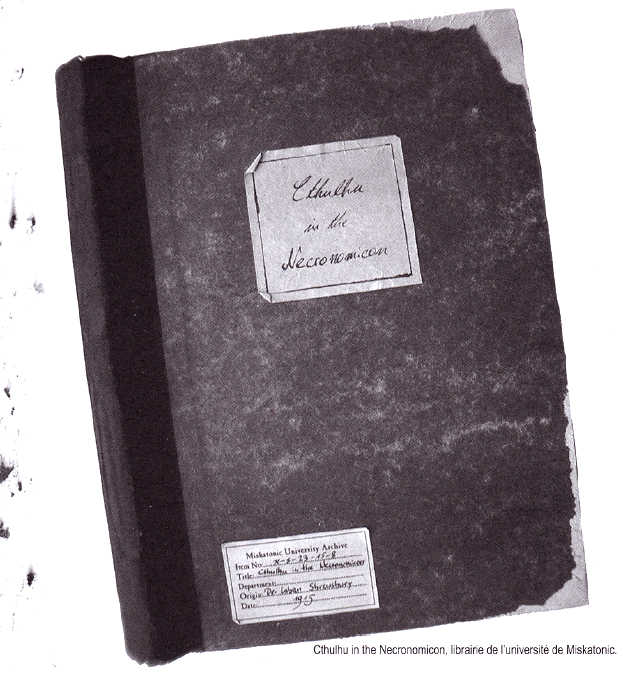 « Ces volumes étaient des dépositaires bannis et redoutés de secrets équivoques et de formules immémoriales qui avaient filtré tout au long des temps […]. Il en avait lui-même lu un grand nombre – une version latine du Necronomicon abhorré, le sinistre Liber Ivonis, l’infâme Culte des goules du comte d’Erlette, les Unaussprechlichen Kulten de von Junzt, le diabolique De Vermis Mysteriis […] – les Manuscrits Pnakotiques, le Livre de Dzyan, et un volume qui s’effritait, aux caractères totalement inidentifiables, mais comportant cependant certains symboles et diagrammes susceptibles de donner des frissons à tout homme versé dans l’occultisme et qui les reconnaîtrait. »