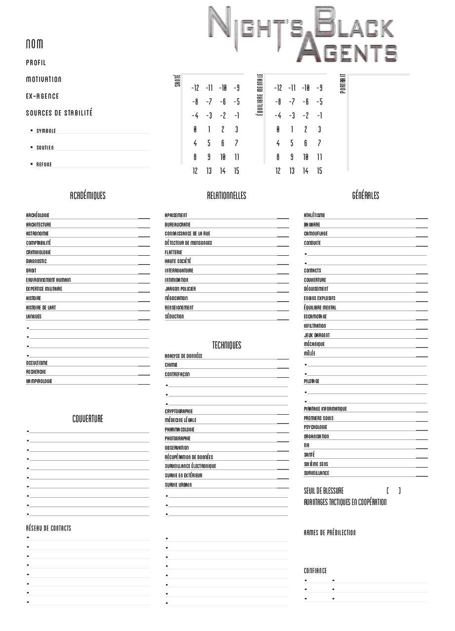 Night’s Black Agents est un jeu qui s’appuie sur le système Détective/Gumshoe pour reproduire ce sentiment grisant de paranoïa propre aux thrillers d’espionnage : pas seulement les James Bond, mais aussi et surtout les films comme Ronin ou la trilogie Jason Bourne. Vous créez des agents dignes de ces œuvres ; coriaces, débrouillards, intelligents, mortels – en un mot, des durs à cuire.