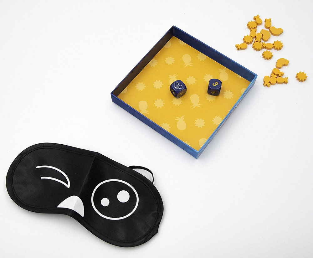 Il s’agit d’un jeu de dés dans lequel on essaie de récupérer le plus de tokens bois selon le total obtenu par les dés. On relance les faces nombres (jaunes) autant de fois que l’on veut. Mais 2 faces Koala et vous êtes obligés de fermer un œil jusqu’à la fin de la partie.