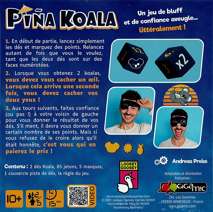 Matériel: 2 dés Koalo, 85 jetons, 5 masques, 1 couvercle Piste de dés, livret de règles