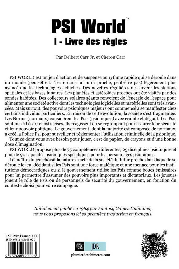 Psi World propose plus de 75 compétences différentes, 25 disciplines psioniques et plus de 90 capacités psioniques spécifiques pour les personnages psioniques.Le maître du jeu choisit la nature exacte de la société du futur proche dans laquelle se déroule le jeu, décidant si les Psis sont une force maléfique et une menace pour les institutions démocratiques ou si le gouvernement utilise les Psis comme boucs émissaires pour lui permettre d’assumer des pouvoirs plus importants et dictatoriaux. Les joueurs jouent le rôle de Psis ou de personnels de sécurité du gouvernement, en fonction du contexte choisi pour votre campagne.