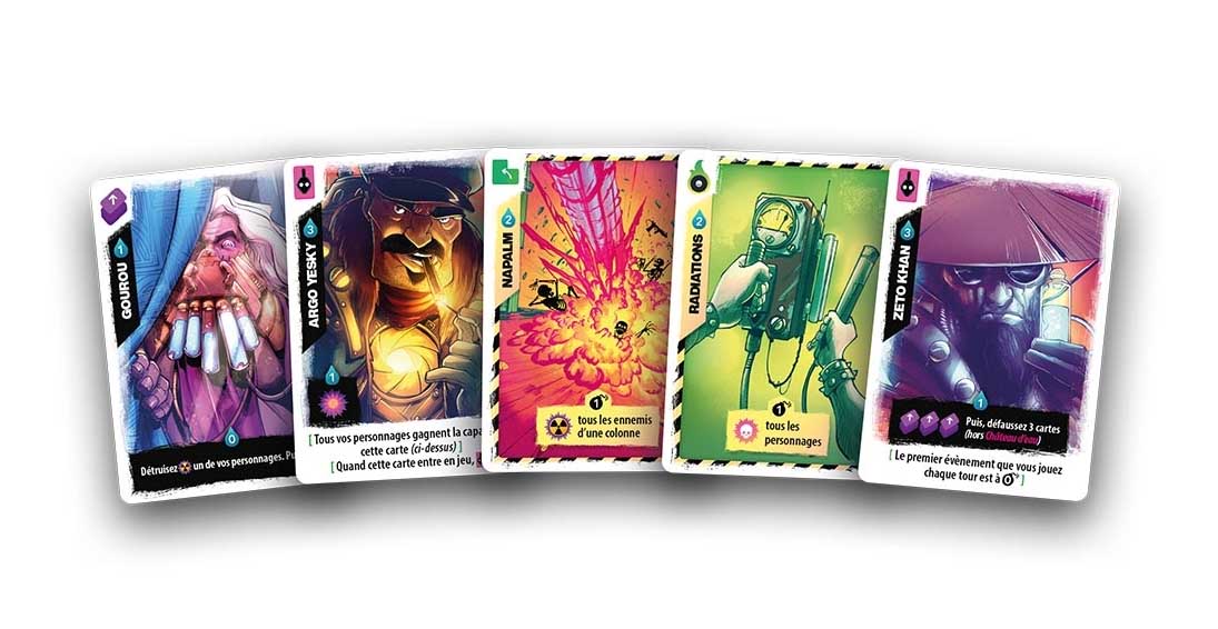 Les personnages protègent vos camps et vous fournissent des capacités utiles, tandis que les évènements sont de puissants effets qui prennent du temps à se déclencher. Les deux adversaires piochent des cartes dans le même paquet. Toutes les cartes de votre main peuvent être jouées soit sur la table, soit défaussées pour des effets rapides de « gaspillage ».