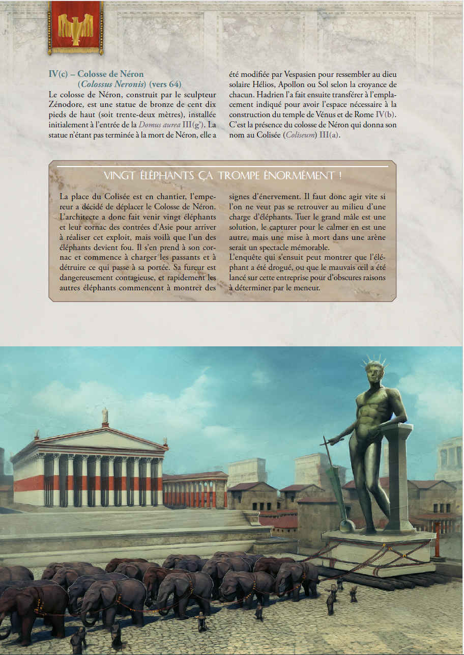 Rome étant une cité millénaire, nous vous proposons dans ce supplément une cité intemporelle, où les monuments sont décrits d’un point de vue géographique et non chronologique. De même, des personnages historiques emblématiques sont décrits sans tenir compte d’une quelconque temporalité.