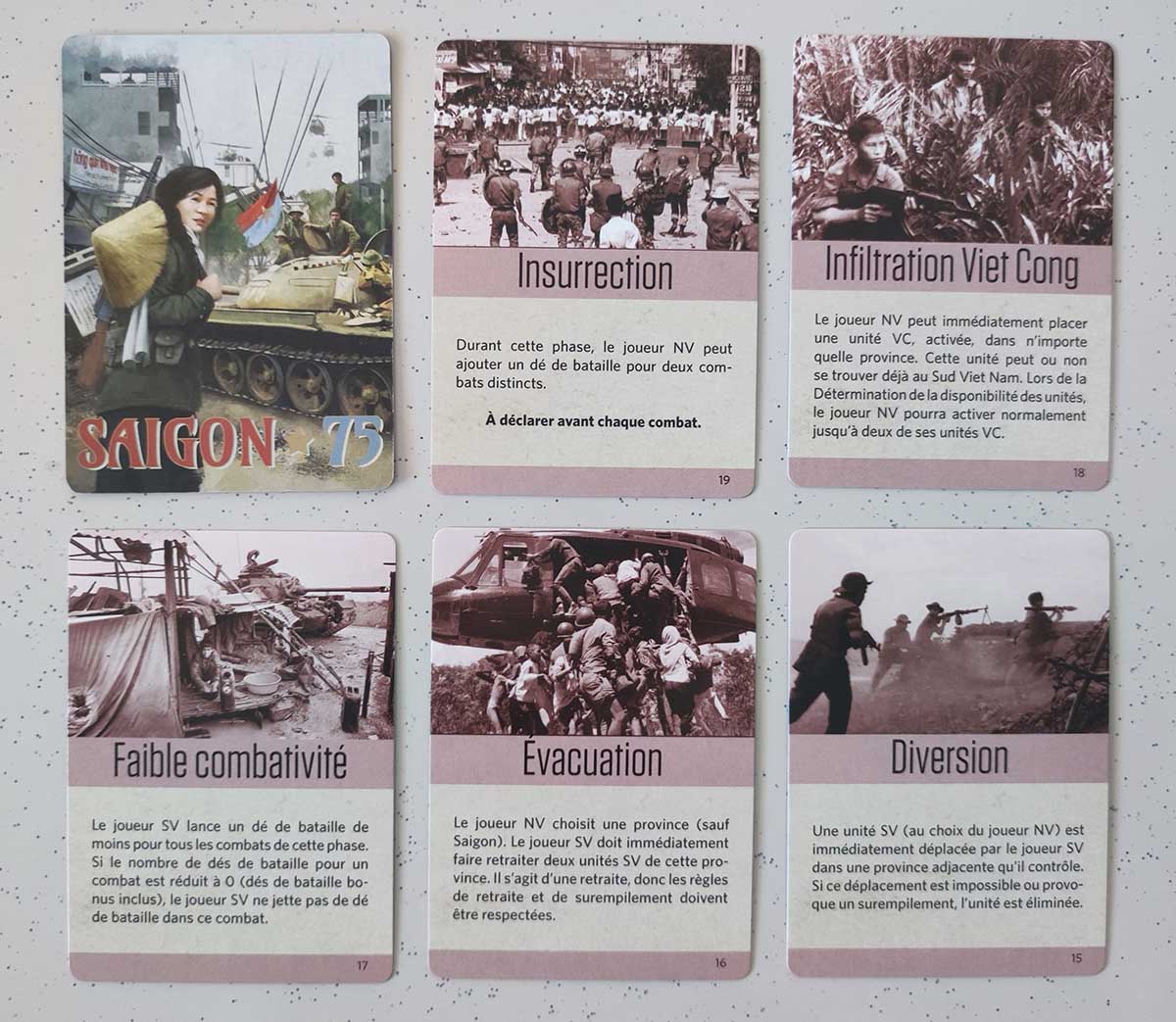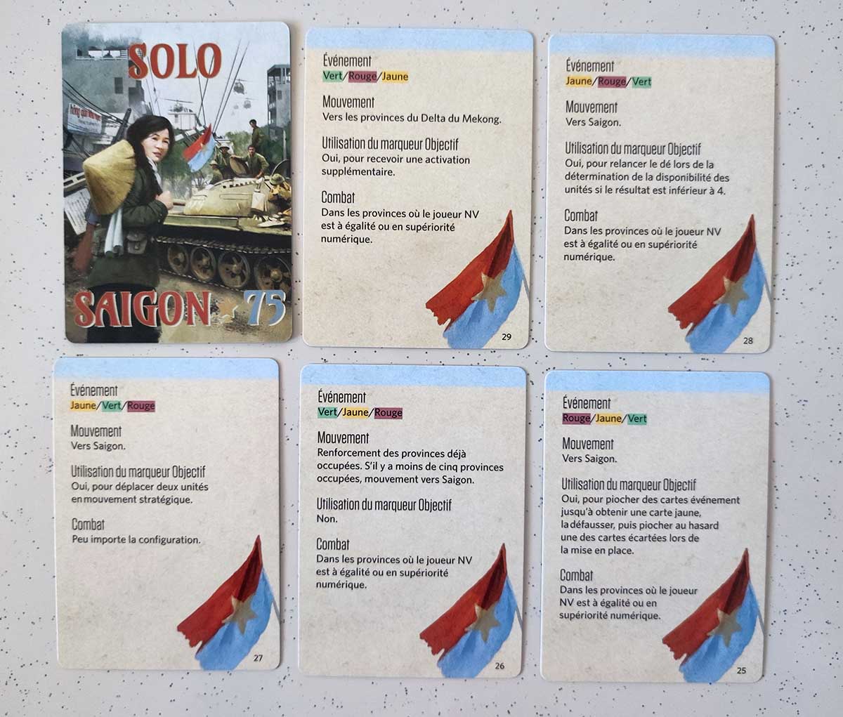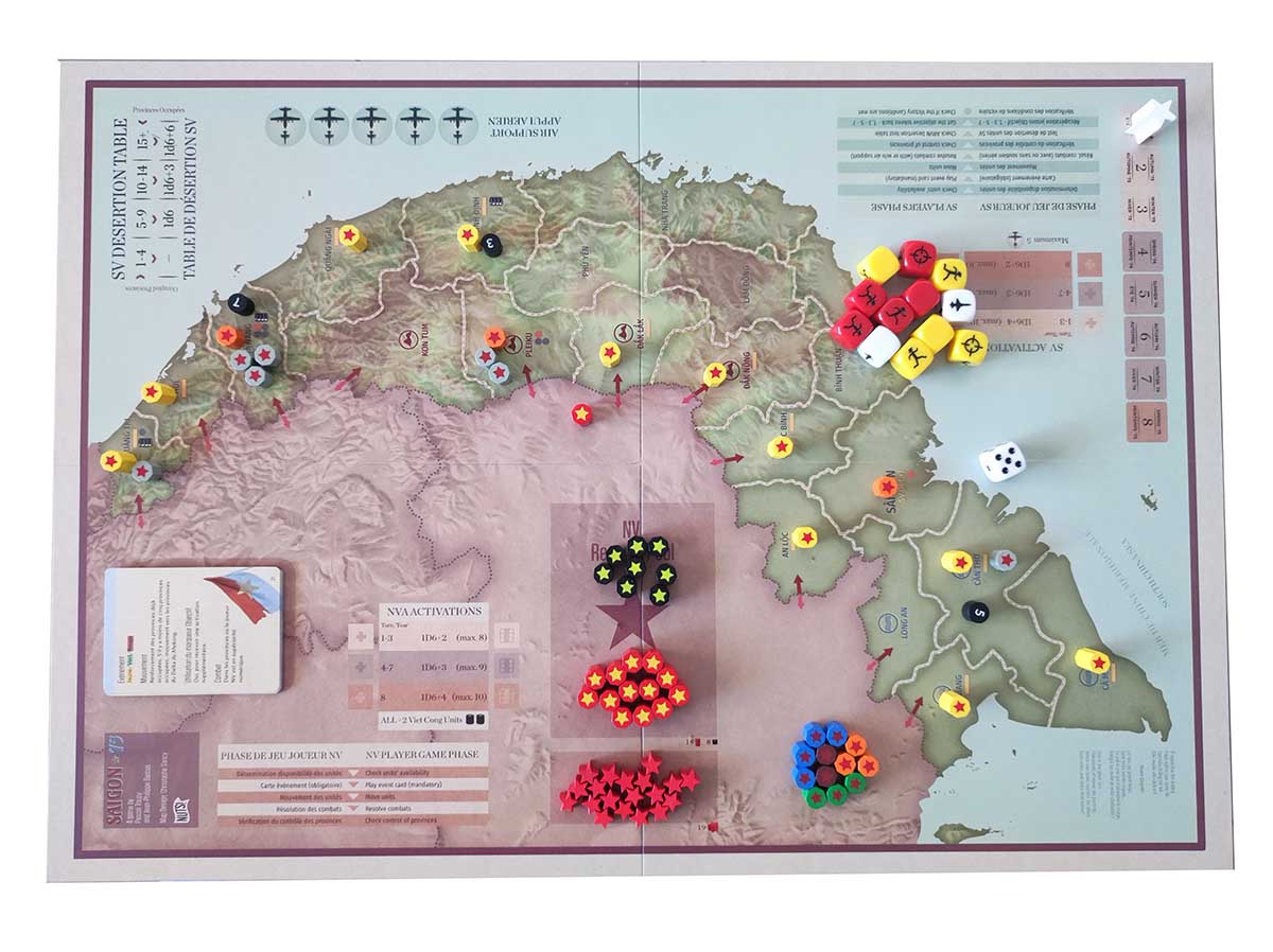 Lors de chaque tour, vous allez devoir jouer une carte événement de votre main. Le nombre d’unités que vous pouvez déplacer et avec lesquelles vous pouvez attaquer est déterminé par un jet de dé (ainsi qu’un modificateur qui dépend du tour en cours). Les combats se résolvent grâce à des lancers de dés, qui déterminent les pertes ennemies ainsi que le nombre d’unités qui doivent retraiter. Le jeu est hautement asymétrique, l’un des joueurs dispose de plus d’activations, d’une plus grande quantité d’événements à son avantage, de meilleurs dés de bataille et la possibilité de mener des assauts sur un très large front, tandis que son adversaire dispose de soutiens aériens ainsi que d’unités parachutées et mécanisées. Le mode solo vous permet d’incarner des forces « libérales » du Sud Viêt Nam pour tenter de résister aux assauts d’un ennemi automatisé, guidé par des cartes spécifiques.