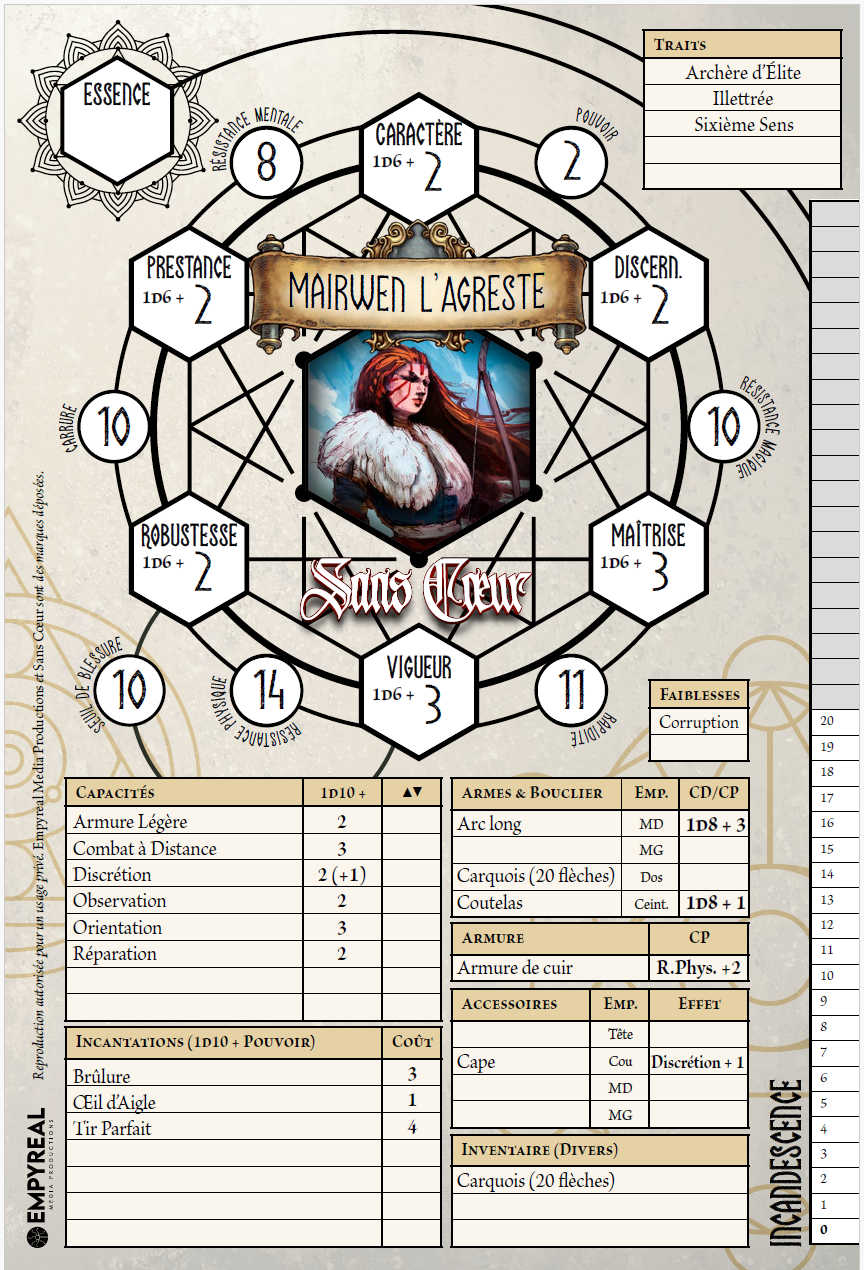 Sans Cœur est un jeu de rôle de dark fantasy dans lequel les joueurs incarnent ces revenants épris de justice. Pour jouer, vous aurez besoin d’une poignée de d6, d8 et d10 et du contenu de ce livre, à savoir :