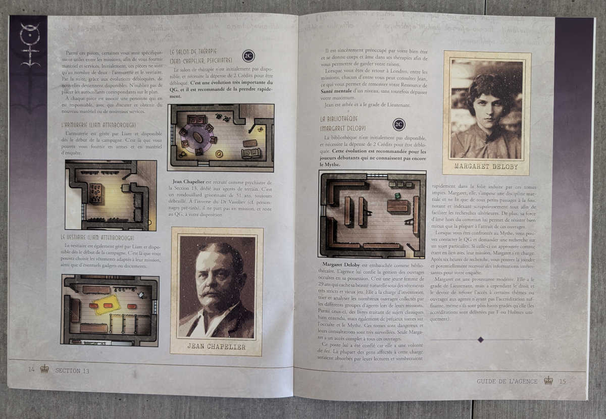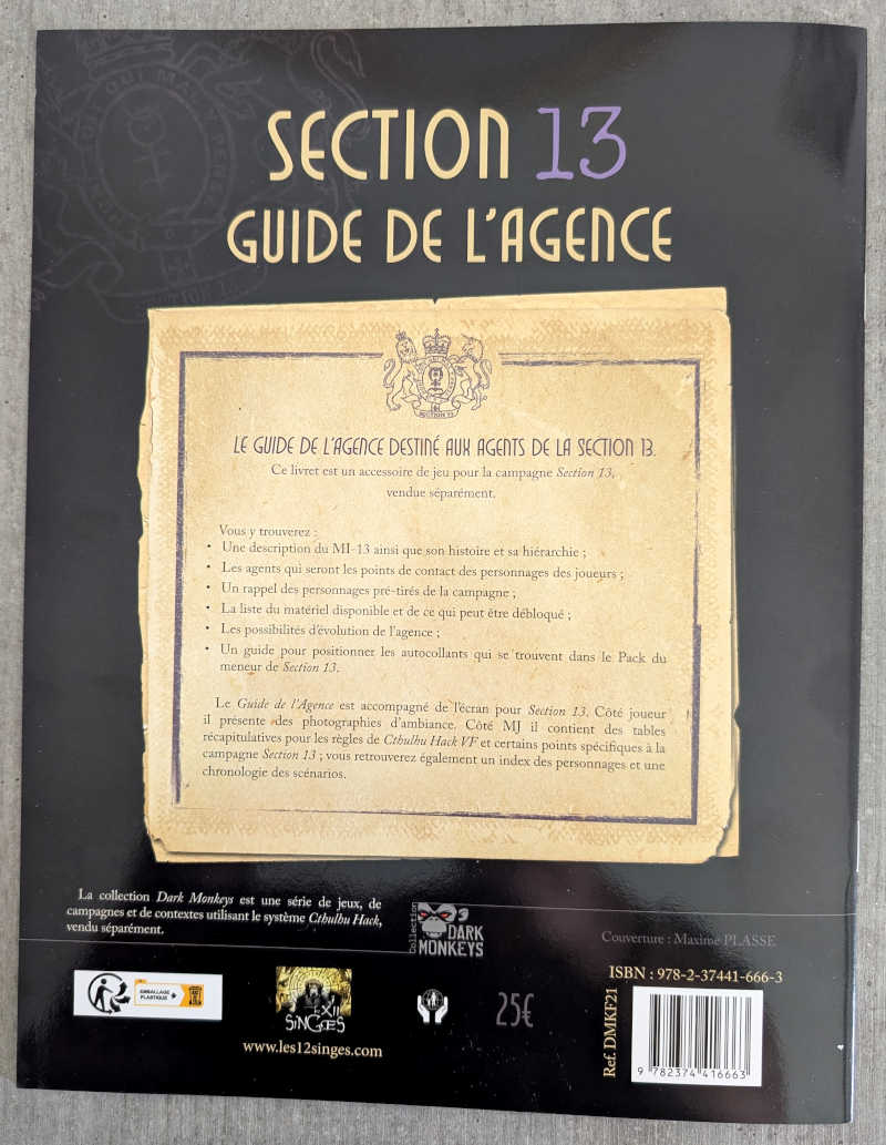 le Guide de l’Agence est accompagné de l’écran du meneur pour Section 13. Côté joueur il présente des photographies d’ambiance. Côté MJ il contient des tables récapitulatives pour les règles de Cthulhu Hack et certains points spécifiques à la campagne Section 13; vous retrouverez également un index des personnages et une chronologie des scénarios.u fil rouge de l’intrigue et peuvent donc être joués de manière indépendante.