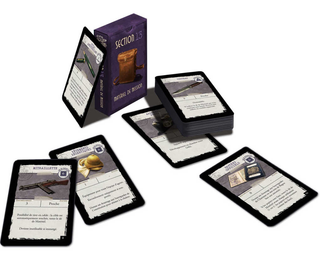 Le paquet de cartes Matériel de mission est spécifique à Section 13. Il contient tout l’équipement disponible durant la campagne. Certaines cartes sont en plusieurs exemplaires, selon le nombre d’objets disponibles à l’Agence.