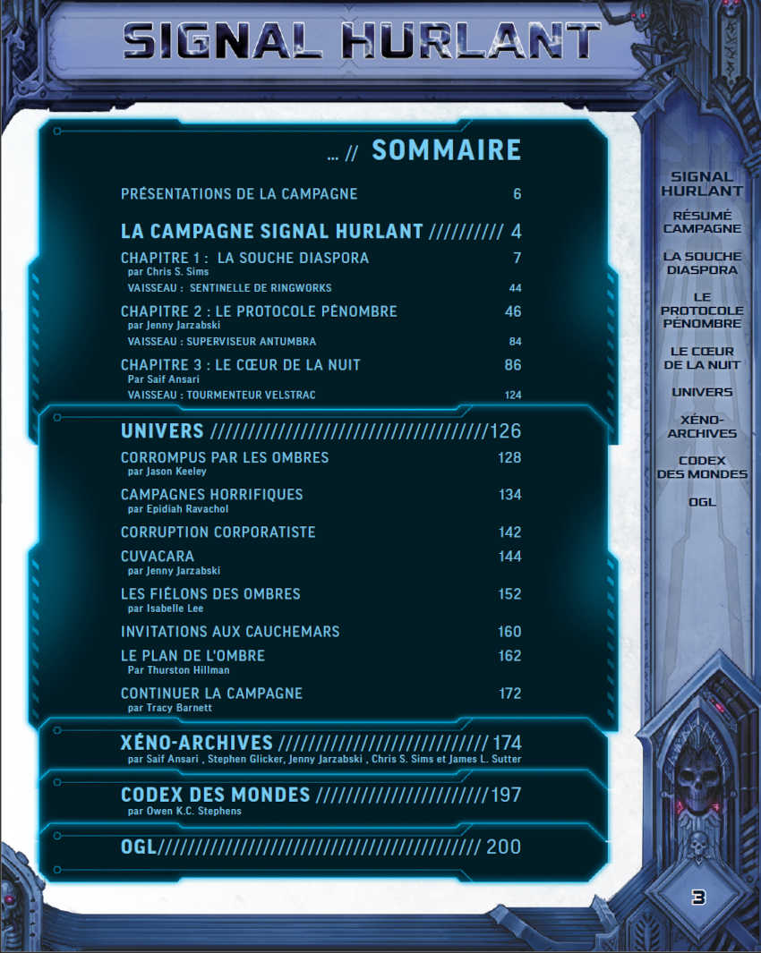 - Les caractéristiques et le plan d’un élégant vaisseau de sécurité, par Chris S. Sims, ainsi qu’un aperçu d’une planète, magnifique et hantée, par Owen K. C. Stephens.