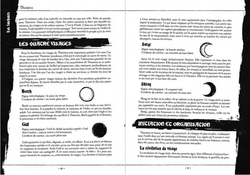 Ce livre de base de Thanatos regroupe tout le nécessaire pour vous lancer dans les drames et les horreurs du royaume de Hartdörf : système de jeu, règles de création de personnages, présentation de Hartdörf et des pays voisins, présentation de la cartomancie, de la magie des artifices et du monde astral, encyclopédie des morts-vivants et scénario.