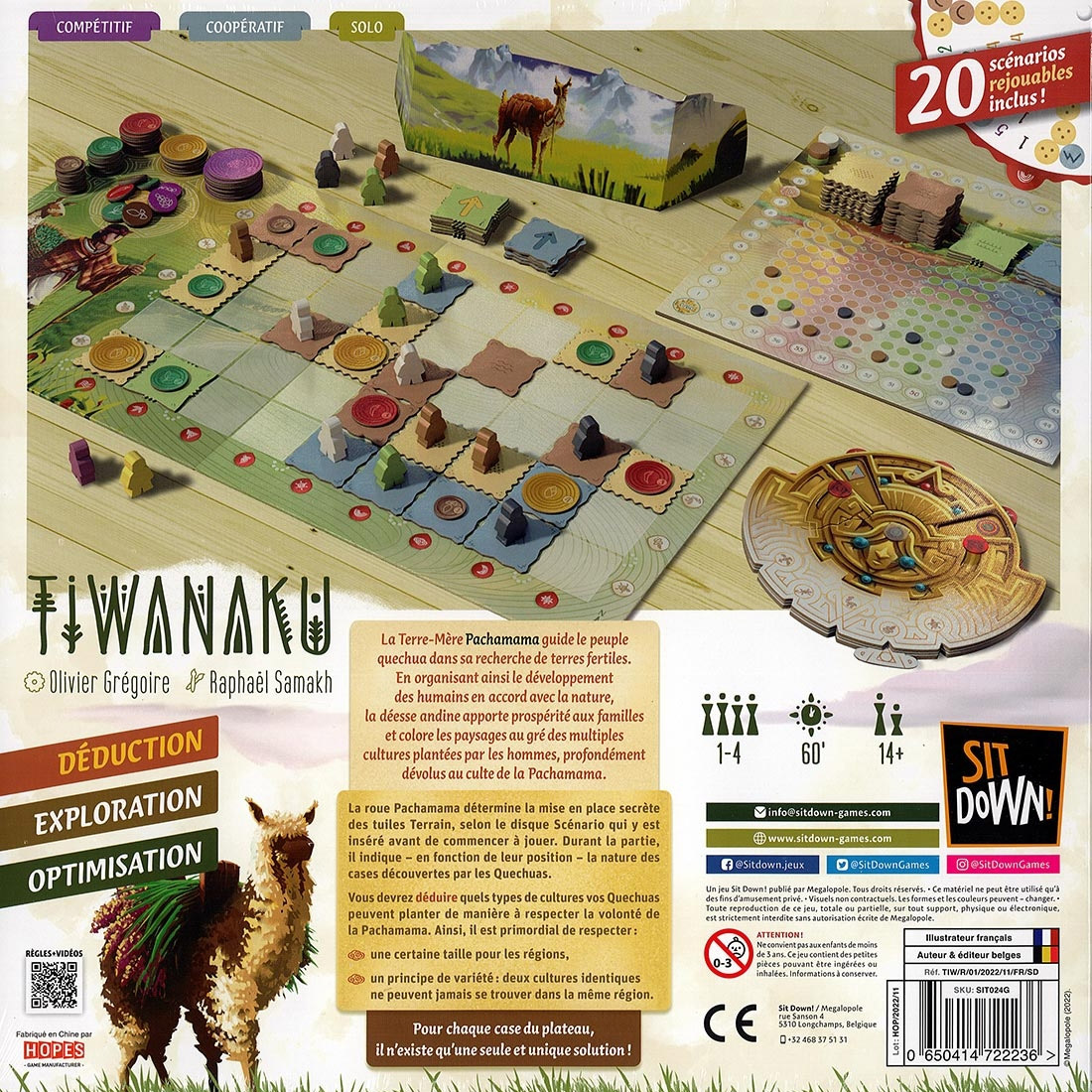 Dans le jeu Tiwanaku, votre peuple arrive dans une vallée que l’Homme n’a pas encore marquée de son empreinte. Explorez ses régions et tâchez de comprendre ce que la Pachamama souhaite que vous plantiez à chaque endroit. La roue Pachamama détermine la mise en place secrète des tuiles Terrain, selon le disque Scénario qui y est inséré avant de commencer à jouer. Durant la partie, il indique – en fonction de leur position – la nature des cases découvertes par les Quechuas. Vous devrez déduire quels types de cultures vos Quechuas peuvent planter de manière à respecter la volonté de la Pachamama. Ainsi, il est primordial de respecter : une certaine taille pour les régions, un principe de variété : deux cultures identiques ne peuvent jamais se trouver dans la même région.