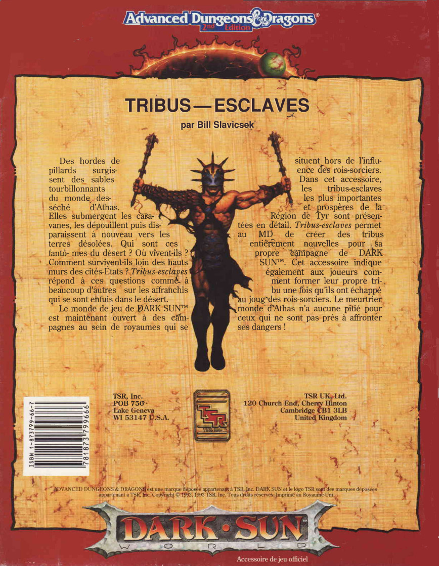 Dans cet accessoire, les tribus-esclaves les plus importantes et prospères de la région de Tyr sont présentées en détail. Tribus-Esclaves permet au MD de créer des tribus entièrement nouvelles pour sa propre campagne de DARK SUN™. Cet accessoire indique également aux joueurs comment former leur propre tribu une fois qu’ils ont échappé au joug des rois-sorciers. Le meurtrier monde d’Athas n’a aucune pitié pour ceux qui ne sont pas près (sic) à affronter ses dangers!