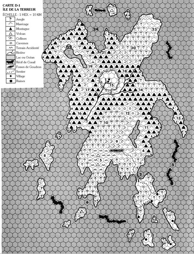 Dans ce module sont inclus des cartes etd escriptions de l’ile, 15 nouveaux monstres et des suggestions pour développer d’autres aventures sur l’Île de la Terreur. Une carte spéciale du continent ainsi que des informations se rapportant à son contexte sont également fournies, de même que 11 cartes plus petites relatives aux rencontres sur l’île elle-même.
