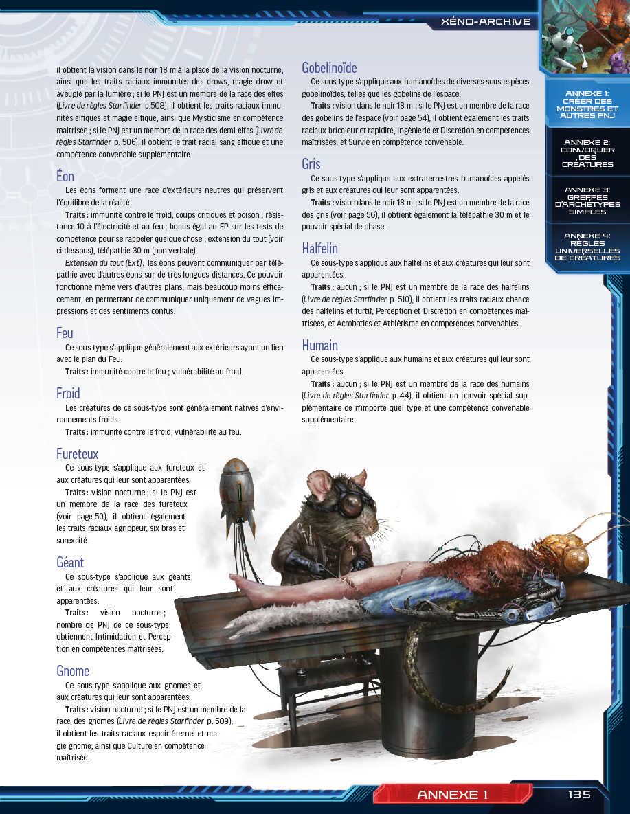 - Plus de 20 races bénéficiant de règles complètes pour les joueurs qui leur permettront de toutes les jouer, depuis les draconiens ailés aux cerveaux flottants hyper-évolués.